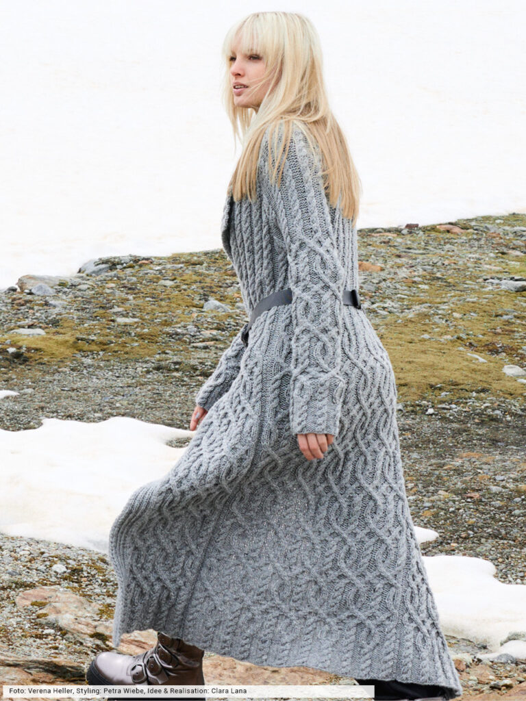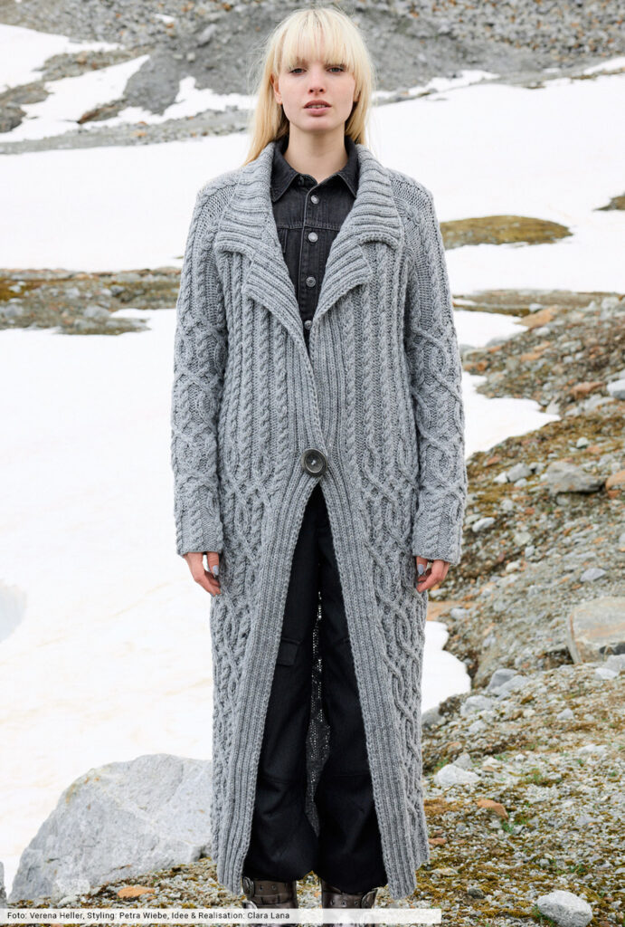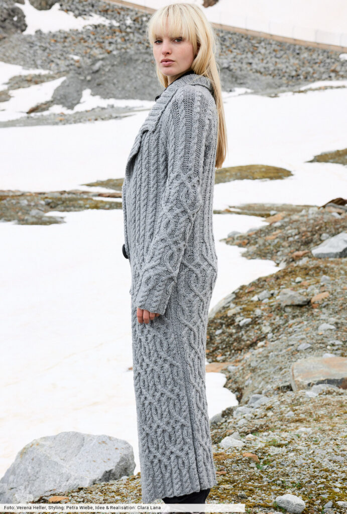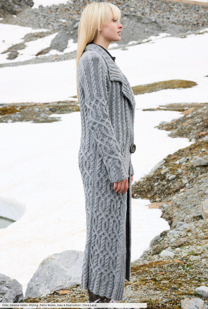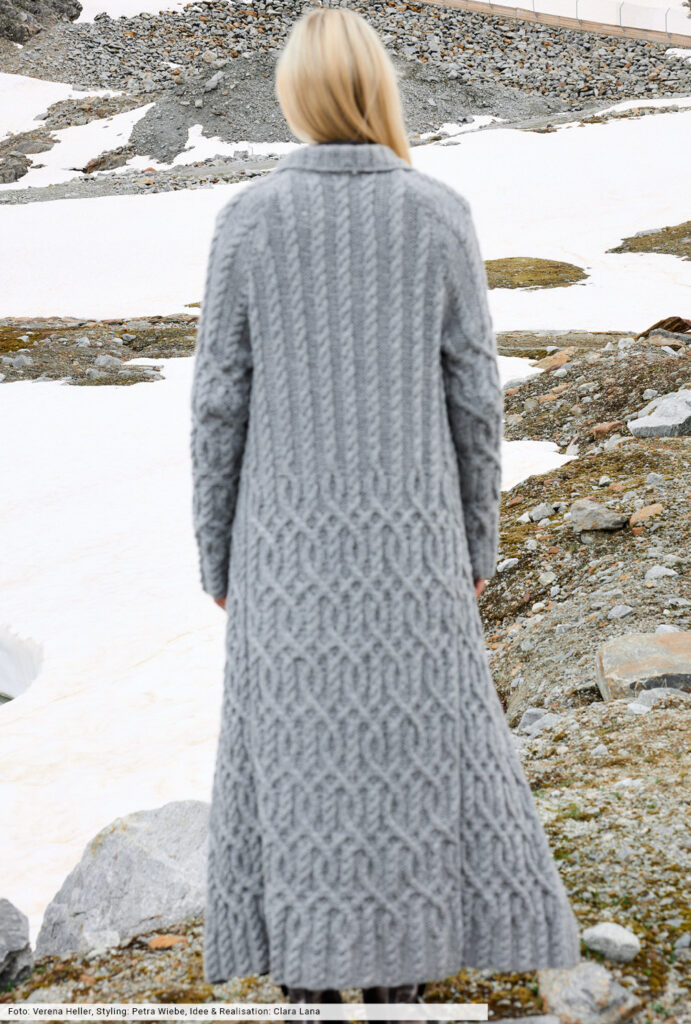 Die rauen Züge einer alpinen Landschaft, schnellbedeckte Felsformationen und eisige Gletschergipfel dienten uns als Inspiration für diesen beeindruckenden Mantel, den wir mit einem Geflecht aus Zopfstrukturen ausgestattet haben. Dafür gibt es in unserer Anleitung eine übersichtliche Strickschrift, nach der du dich orientieren kannst. Die Abnahmen für die Raglanschrägungen und die Zunahmen für den Reverskragen haben wir ebenfalls genau beschrieben.