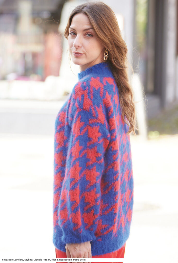 Der ausdrucksstarke Mohairpulli wird mehrfädig aus verschiedenen Mohair-Qualitäten mit hohem Seidenanteil gestrickt – trotzdem ist er ein Federgewicht! Das grafische Allover-Jacquardmuster kommt durch die kräftigen Farben besonders gut zur Geltung. Gestrickt wird der flauschige Pullover in Einzelteilen, wobei Vorder- und Rückenteil bis zum Beginn des Halsausschnitts gerade hoch gearbeitet werden und auch die Ärmel ohne Zunahmen auskommen. Dadurch entsteht nicht nur der lässige Schnitt, auch das plakative Muster bleibt durchgehend erhalten und während des Strickens kann man sich ganz allein auf das Muster konzentrieren. Die farbige Strickschrift in der Anleitung hilft zusätzlich dabei, stets den Überblick zu behalten. Sind alle Teile fertig, werden nur noch die Nähte geschlossen, die Ärmel eingenäht und der Halsausschnitt bekommt noch die Rippenblende angestrickt.