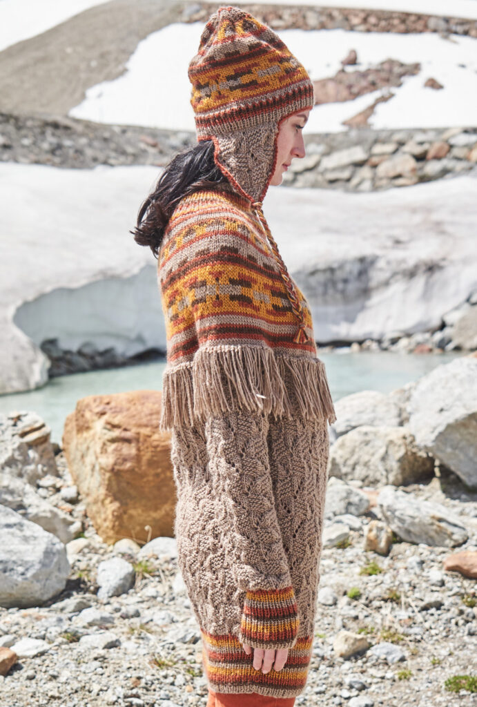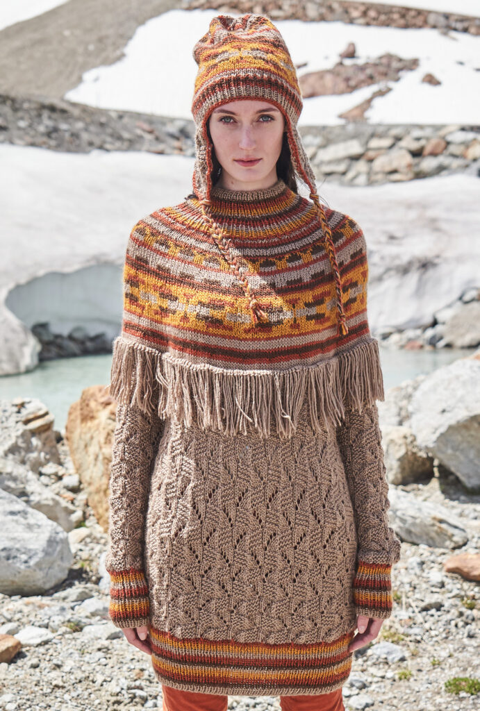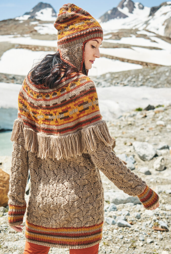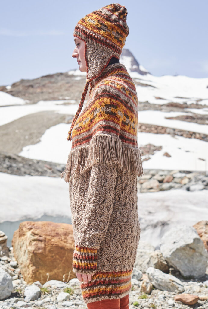 Was für ein geschicktes Design! Durch die raffinierte Anordnung der Muster und Farben wirkt es fast so, als würden wir einen Poncho über einem Lacepulli tragen – nur ist unser Modell viel bequemer! Begonnen wird der Pulli von oben nach unten mit der Passe im Jacquardmuster und in der Streifenfolge. Ist die Passe fertig, wird sie erst einmal bei Seite gelegt und das Vorderteil, das Rückenteil und die Ärmel von unten nach oben gestrickt. Erst das Rippenbündchen im Streifenmuster, dann der Rest im Ajourmuster. Dieses ist nicht kompliziert und lässt sich leicht merken. Die Strickschrift ist übersichtlich und zeigt uns stets, was wir als nächstes stricken müssen. Sind alle Teile fertig, werden die zuvor stillgelegten Maschen des Vorder- und Rückenteils, sowie der Ärmel auf eine Nadel genommen, die stillgelegten Maschen der Passe kommen auf eine weitere Nadel. Beide Teile links auf links legen und zusammen abketten – schon ist alles miteinander verbunden. In die Maschen der Abkettrunde werden dann noch die Fransen geknüpft, danach alle weiteren Nähte schließen.