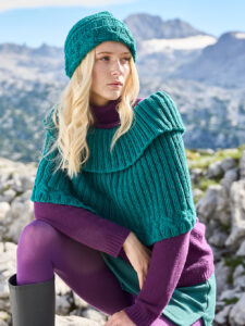 Eine Zopblende für den Abschluss, den Rest in Längsrippen – so einfach strickt sich das kurze Cape, durch dessen oberen Rand ein Hutgummi zur Stabilisierung gezogen und zum Schluss nach außen umgeschlagen wird. Das gleiche Spiel bei der passenden Mütze: Auch hier beginnt man mit der Zopfblende und setzt die Arbeit mit Querrippen fort. Ein selbstgemachter Pompon bildet den kessen Abschluss. Beide Teile garantieren durch das luxuriöse Kaschmirgarn bei Minunsgraden Wärme und Behaglichkeit.