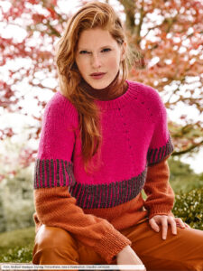 Nahtlos stricken kommt nie aus der Mode und ist einfacher als es aussieht. Hier als stilvoller Pulli, der von oben nach unten und größtenteils glatt rechts gestrickt wird. Dazwischen sorgt die Passe im zweifarbigen Patentmuster für Spannung und bildet einen starken Kontrast zum zimtbraunen unteren Teil und zum pinkfarbenen oberen Teil des Pullis. Aus edlem Schurwoll-Alpakagarn ein Stück fürs Leben!