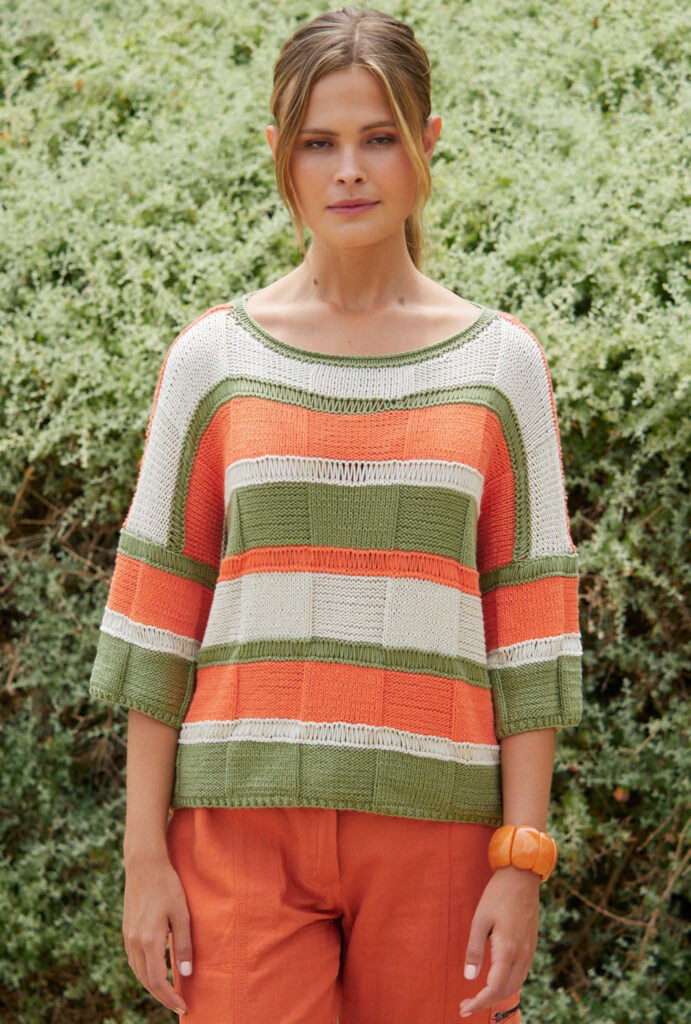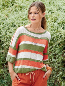 Lässig oversized mit sportlichen Streifen hat dieser Pulli das Zeug, zum Lieblingspulli dieses Sommers zu werden. Die dezenten und dennoch ins Auge springenden Farben (Olive, Koralle, Sand) des Baumwolle-Viskose-Mischgarns sind ein idealer Kombipartner für lässige Shorts oder Jeans. Sowohl bei den glatt rechts und glatt links gestrickten breiten Streifen, als auch bei den schmalen Fallmaschenstreifen, kommen alle Farben in gekonnt harmonischer Abstimmung vor. Die Bündchen werden als 1/1 Rippen mit rechtsverschränkten und linken Maschen gearbeitet, der weite runde Halsausschnitt hat eine Einfassung in glatt rechts. Eine Anleitung steht für die Größen 36/38, 40/42 und 44/46 zur Verfügung.