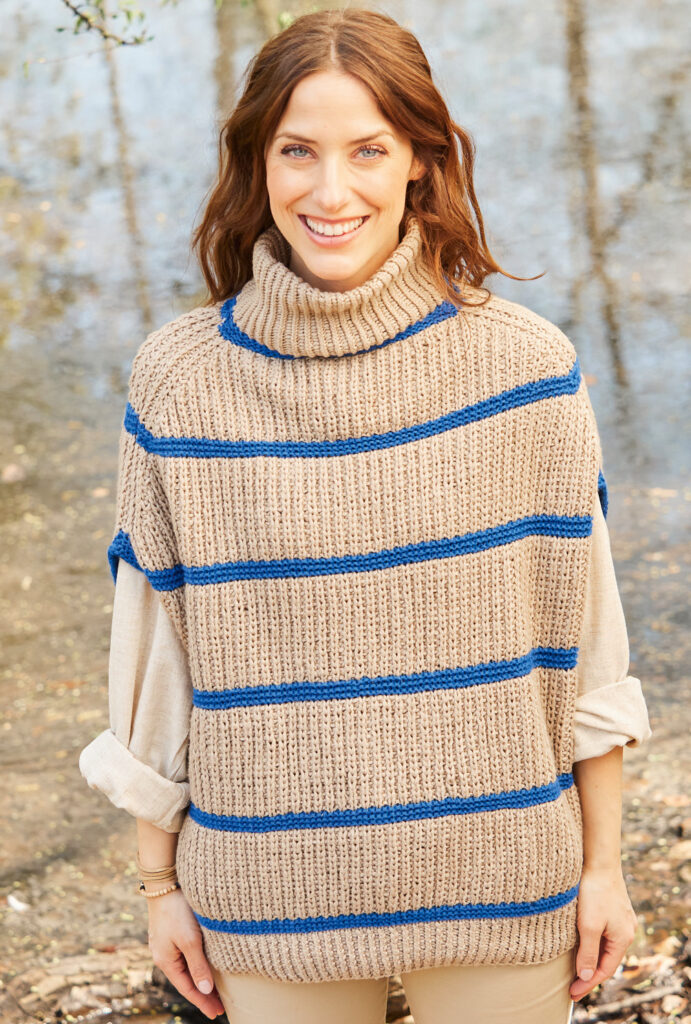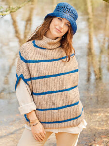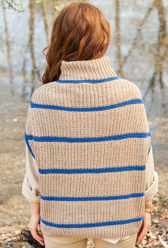 Lässigkeit ist Trumpf! Mit diesem tollen Oversize-Pullunder kannst du jede Alltagshürde problemlos überstehen. Vorder- und Rückenteil werden separat von untern nach oben gearbeitet. Der kuschelige Rollkragen wird zum Schluss angestrickt. Die starke Schulterschrägung ist perfekt für einen lockeren Sitz deines neuen Lieblingsteils. Auch wer das erste Mal mit zwei Farben arbeiten möchte, hat hier das perfekte Projekt gefunden. Durch das Halbpatent-Muster wird der Pullunder richtig dick und flauschig.Das sieht nicht nur schick aus, sondern hält auch noch warm. gestrickt werden kann ich den Größen 36 – 42, 44 – 48 und 50/52. Du kannst nach dem Download direkt beginnen.