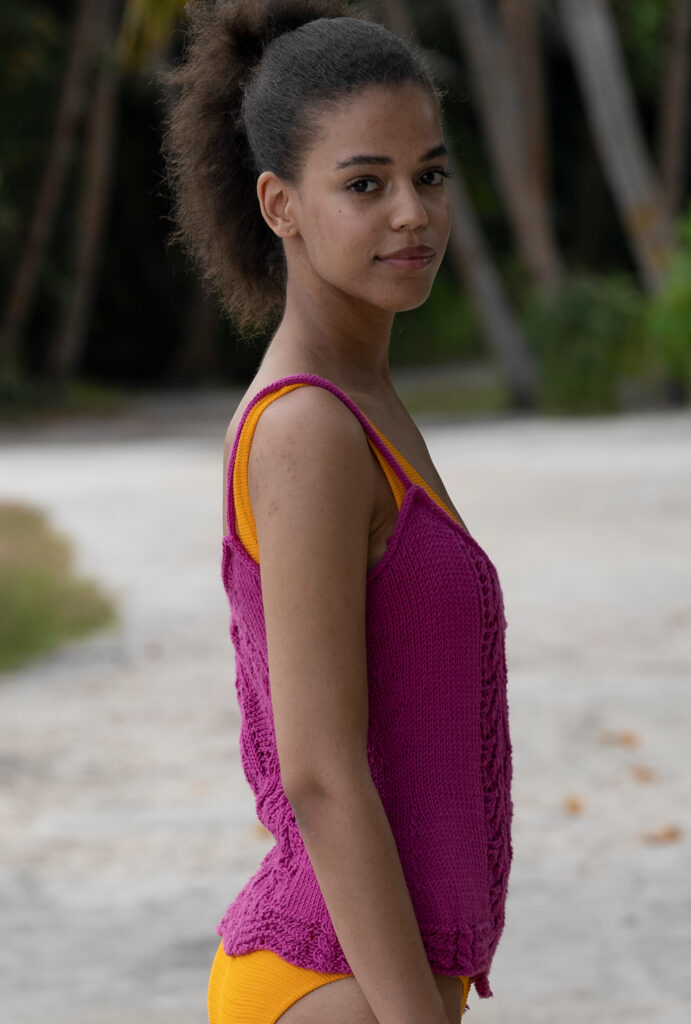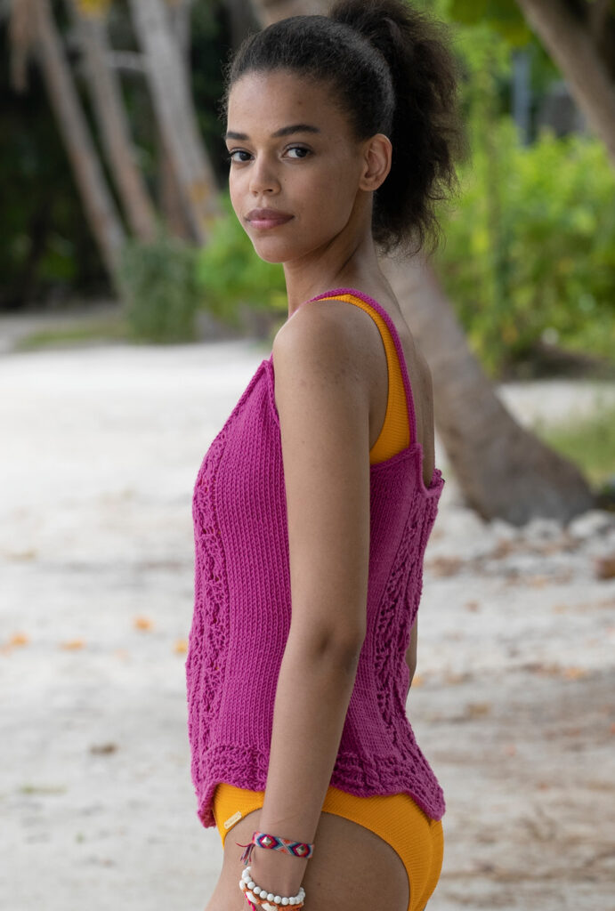 Bei Temperaturen um die 30 Grad kommt uns dieses sommerliche Baumwoll-Top gerade recht. Durch die leichte Taillierung sitzt es wie angegossen. Mustergültig sind die Wellenlinien für die Saumkante und der breite Ajourmusterstreifen in der Mitte. Außerdem brauchst Du eine Strickmühle, mit der Du ganz schnell und einfach die dünnen Träger herstellen kannst. Die Blende am oberen Rand entsteht durch einen I-Cord, den wir in unserer Anleitung genau beschrieben haben.