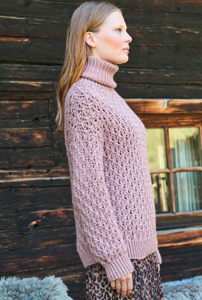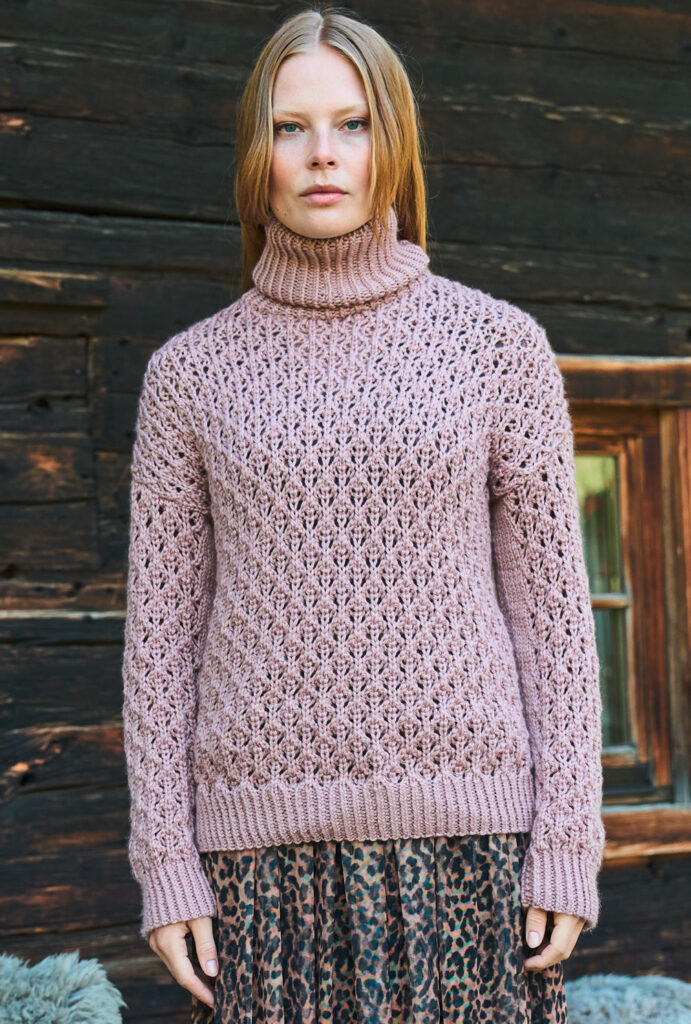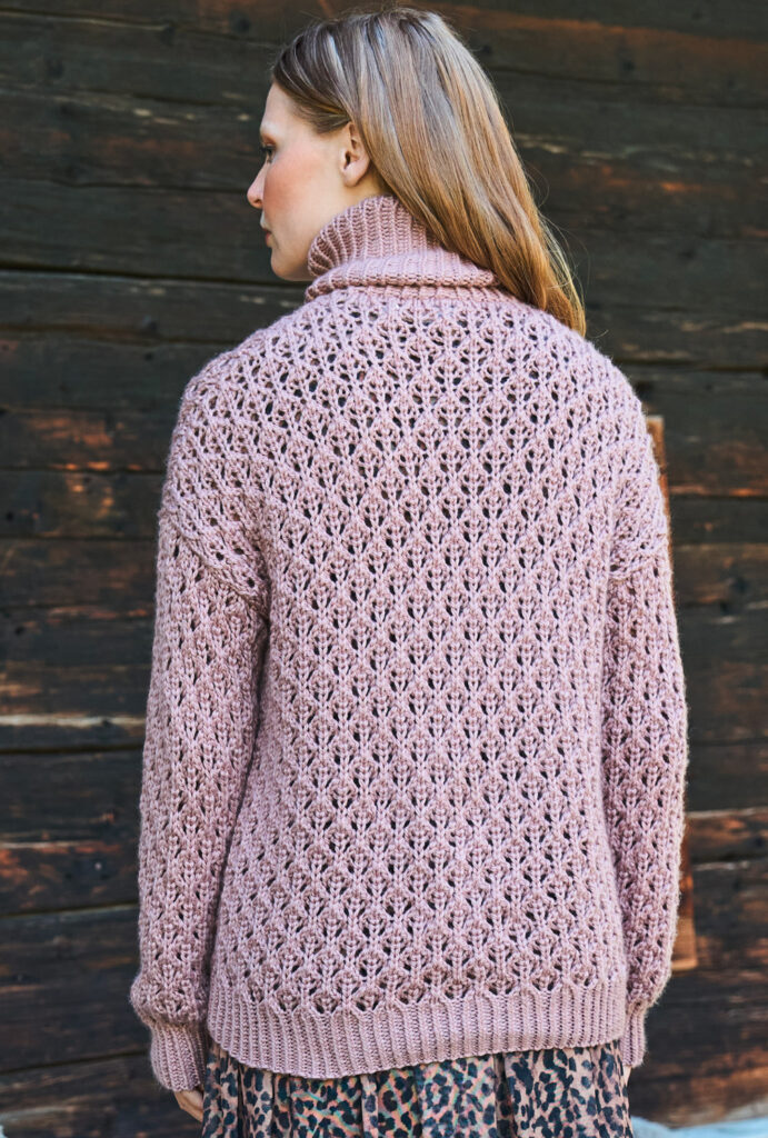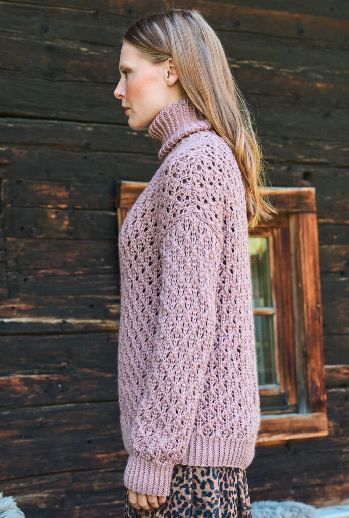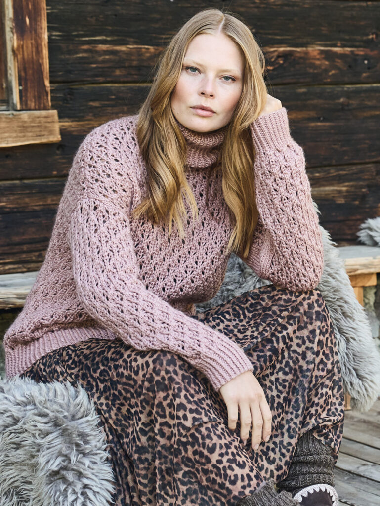 Bei sinkenden Maschen haben etwas gröbere Maschen ihren großen Auftritt. Dazu gehören dickere Garne, wie bei diesem klassisch geschnittnen Pullover, dessen griffige Schurwolle mit Nadel Nummer 5,5 verstrickt wird. Dadurch kommt das schmeichelnde Ajourmuster noch schöner zur Geltung, für das wir eine übersichtliche Strickschrift angelegt haben. Eingerahmt wird das Ganze durch elastische Bündchen in Rippenstrukturen und einem hohen Rollkragen, der die Halspartie umschmeichelt. In sanftem Altrosa ein Stück fürs Leben!