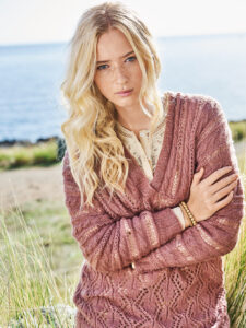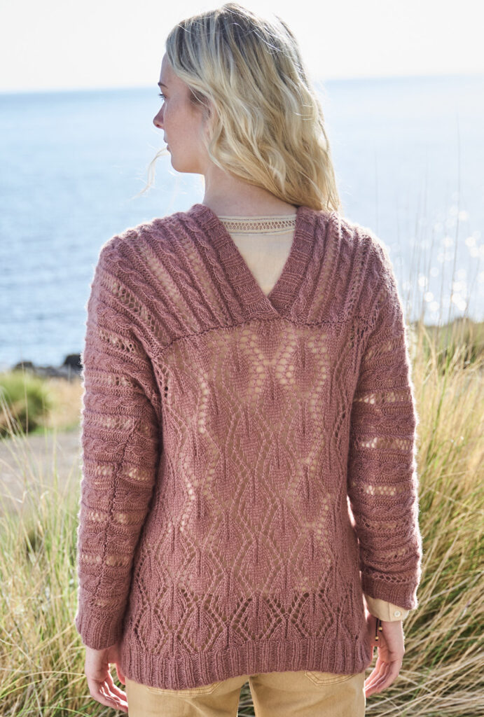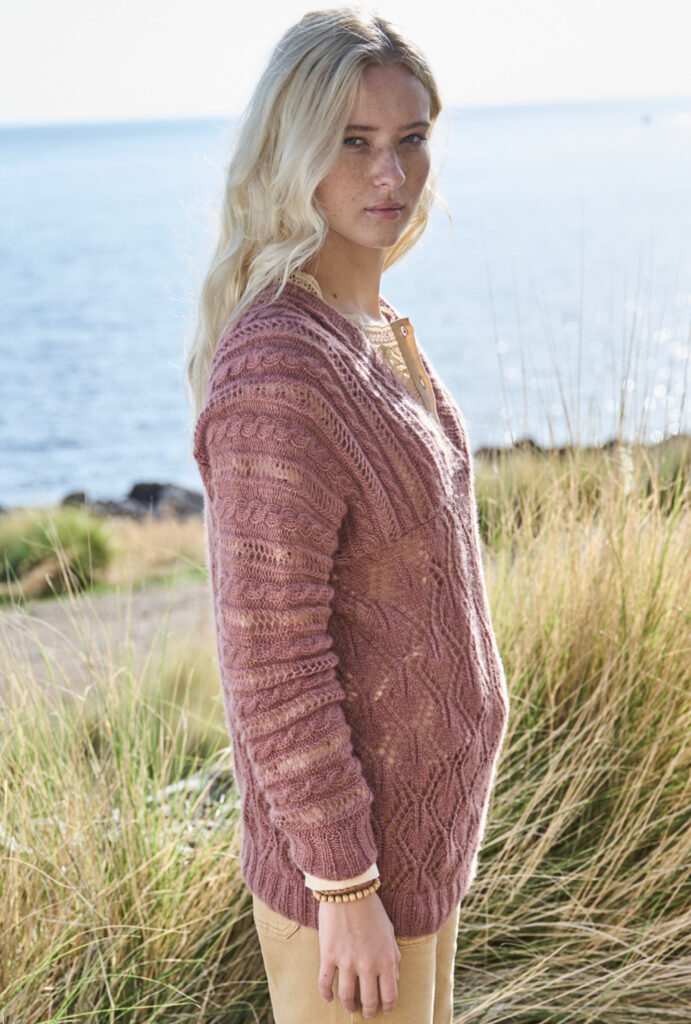 Eine Wohltat für Körper und Seele ist dieser Pulli, dessen Garn sich aus weichem Kaschmir und edler Seide zusammensetzt. Das leicht transparente Rautenmuster zieht sich nur über das untere Vorder- und Rückenteil. Ein ausdrucksvolles Zopf-Lochmuster vervollständigt das Ganze. Es wird quer gestrickt und lässt die Ärmel mit Schulterpasse entstehen, deren seitliche Ränder die geraden Ausschnittkanten bilden. Diese werden zum Schluss mit einer elastischen Blende aus Rippenstrukturen umstrickt, die auch für die Bündchen am Pullisaum und an den Ärmeln zum Einsatz kommen.