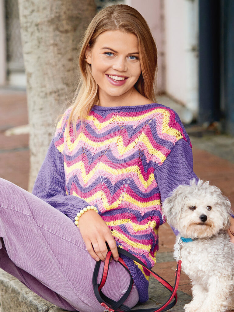 Bei diesem mehrfarbigen Baumwoll-Pulli kommt nie Langweile auf, – dafür sorgt das außergewöhnliche Ajour-Streifenmuster in vier kraftvollen Farben, das sowohl in Zacken- als auch in Wellenform angeordnet ist. Alle Teile sind ganz gerade geschnitten, lediglich die Ärmel beginnen mit etwas engeren Bündchen, um die Ärmelweite zu regulieren, werden danach aber gleich durch starke Zunahme von Maschen recht weit. Vorder- und Rückenteil haben die Streifenfolge von Zitronengelb, Zyklam, Pflaumenblau und Rosa, die Ärmel sind schlicht Pflaumenblau. Die Anleitung kann für die Größen 36/38, 42/44 und 50/52 downgeloadet werden.