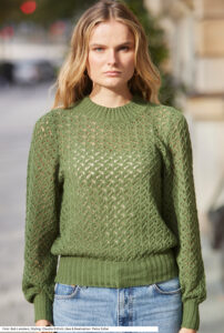 Ein Leichtgewicht von einem Pulli! Das Allover-Ajourmuster lässt tief blicken. Mit einem kontrastfarbigen Tanktop darunter kommt das Muster besonders deutlich zur Geltung, mit einem T-Shirt in der gleichen Farbe wie der Pulli sieht das Ganze zurückhaltender aus. Man möchte diesen Pulli am liebsten nicht mehr ausziehen, weil er so angenehm zu tragen sind. Das liegt am überaus weichen, leichten Kettgarn aus Schurwolle und Polyamid. Dank der Ärmel mit Armkugel sitzt das Modell an den Schultern perfekt. Bündchen und Ausschnittblende sind im 2/2-Rippenmuster gearbeitet. Eine Anleitung gibt es für die Größen 38/40, 42/44 und 46/48.