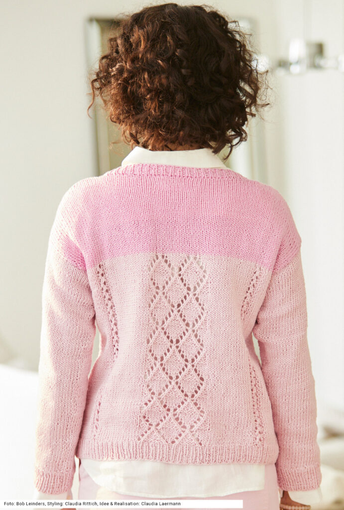 Dieser Pulli wird aus einem Garn gestrickt, das zu 100 Prozent aus Bio-Baumwolle hergestellt ist. Das gerade geschnittene Modell mit zwei dezenten Lochmustern an den Seiten und einem breiteren Ajourrautenmuster in der Mitte wird ansonsten glatt rechts gestrickt. Es werden harmonisch zwei Rosa-Töne kombiniert: unten Hellrosa, an der Schulterpasse mittleres Rosa. Alles Gerade eingesetzte Ärmel ergeben lässig überfallende Schultern. Alle Bündchen und die Blende am runden Halsausschnitt sind im 1/1-Rippenmuster gestrickt. Eine Anleitung steht in den Größen 36/38, 40/42 und 44/46 zur Verfügung.