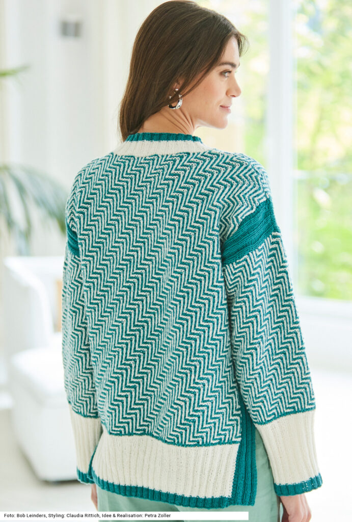 Das versetzt gearbeitete Hebemaschenmuster dieses Pullovers sorgt für eine herrliche diagonale Dynamik. Beim Stricken ist die volle Aufmerksamkeit gefragt, damit man sich nicht vertut bei den kraus rechts gestrickten und abgehobenen Maschen. Seitlich an den hohen zweifarbigen Rippenbund wird ein unifarbener Rippenstreifen bis zu den Schultern angenäht. Auch der runde Halsausschnitt und die Ärmelbündchen bekommen ein zweifarbiges Rippenmuster. Weite, gerade Ärmel sind einfach anzunähen. Seitenschlitze sorgen für einen weiteren Hingucker. Eine Anleitung für das Modell aus einem Schurwolle-Baumwolle-Mischgarn gibt es für die Größen 38/40, 42/44 und 46/48.