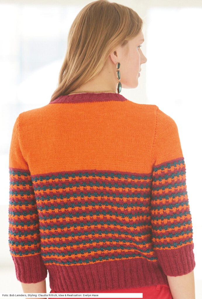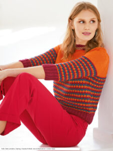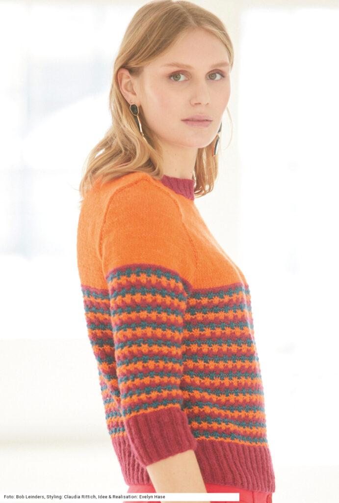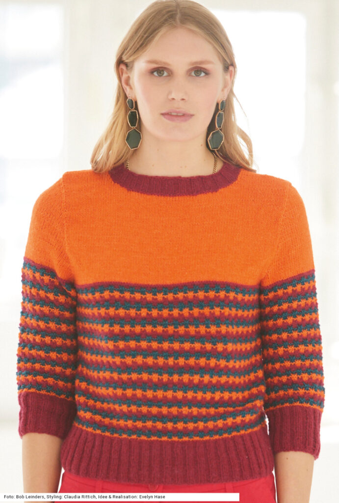 Dieser Pulli punktet im oberen Bereich durch seine Farbkraft in Orange, während im unteren Teil und im Bereich der Ärmel ein dreifarbiges Hebemaschenmuster im Fokus steht. Die weinroten Bündchen und die Ausschnittblende sorgen für einen stimmigen Ausgleich der beiden Partien. Beim Hebemaschenmuster werden die beiden Farben Weinrot und Orange von Petrol zusammengefügt. Ärmel mit Armkugel garantieren einen perfekten Sitz im Schulterbereich. Das Garn aus einer Mischung von Baumwolle, Alpaka, Seide und Schurwolle läuft flott über die Nadeln. Eine Anleitung steht für die Größen 36/38, 40/42 und 44/46 zur Verfügung.