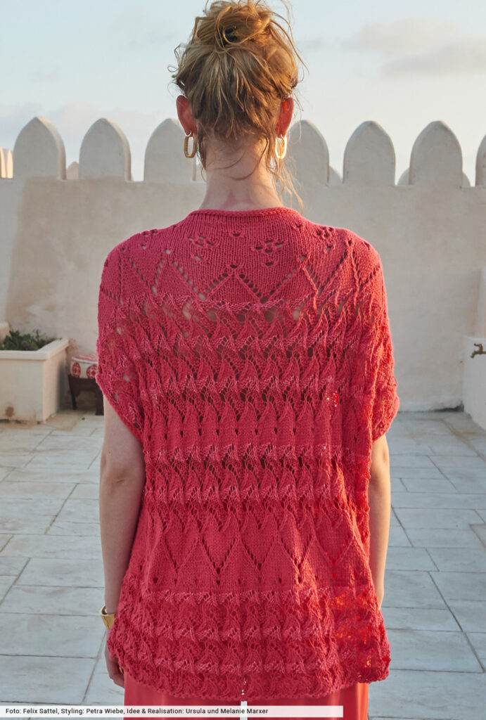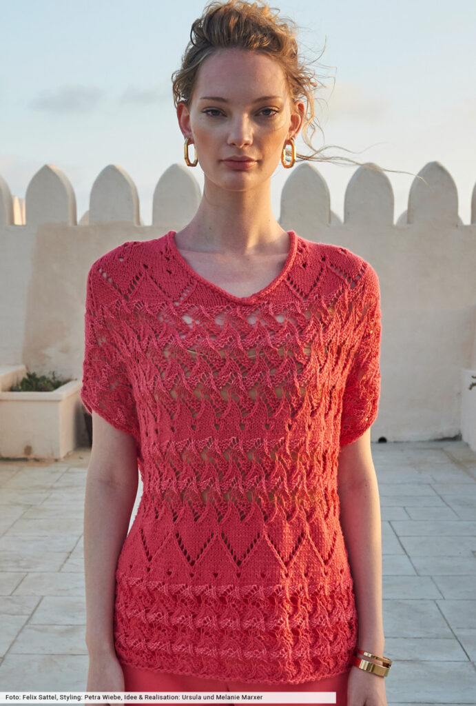 Ein sommerliches Highlight auf der ganzen Linie: Bei diesem Pulli kommen nicht nur drei verschiedene Garne zum Einsatz, die wir alle in Koralletönen präsentieren – einer Trendfarbe, die jeder Frau gut zu Gesicht steht. Auch verschiedene Loch- und Ajourmuster setzen sich gekonnt in Szene. Dafür haben wir in unserer Anleitung jeweils eine Strickschrift erstellt, mit deren Hilfe du dich orientieren kannst.