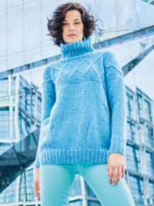 So ein Pulli mit Rollkragen ist herrlich anschmiegsam und zudem toll zu kombinieren. Er ist klassisch geschnitten, mit überschnittenen Schultern und gerade eingesetzten Ärmeln. Die Seitennähte werden in Bundhöhe offen gelassen und bekommen so eine kleine Besonderheit. Die Bündchen sind im 2/2-Rippenmuster gestrickt, dann folgt eine große Partie glatt rechts, der Pulli endet mit einem großzügigen Rhombenmuster in ganzer Breite. Auch der Rollkragen hat diese 2/2-Rippen. Eine Anleitung steht für die Größen 38/40 und 42/44 sowie 46/48 zur Verfügung.