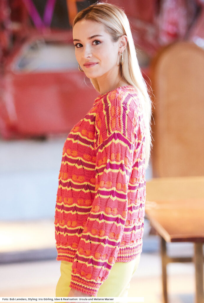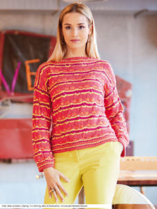Dieser ganz gerade geschnittene Pulli mit weiten geraden Ärmeln hat einen wunderbar dynamischen Charakter – das liegt am harmonischen Farbmix sowie dem plastischen Wellenmuster, das durch die Farbstreifen seine Lebendigkeit hervorhebt. Saum- und Ärmelbündchen und die Blende am geraden Halsausschnitt sind ebenfalls in den vier Farben Rot, Koralle, Fuchsia und Goldgelb als 1/1 Rippen gearbeitet. Das Einnähen der Ärmel an den überfallenden Schultern ist einfach, da hier keine Rundung ist. Die Anleitung für dieses Modell aus Baumwolle-Viskose-Mischgarn ist für die Größen 36/38, 44/46 und 50/52.