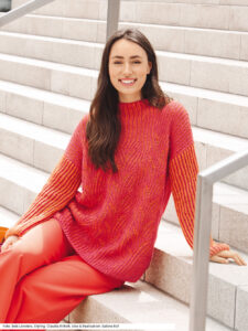 Bei diesem bequem geschnittenen Pulli verbinden sich Orange und Pink zu einem spannenden Farbmix. Dafür sorgt das abwechslungsreiche Brioche-Muster, das allerdings einige Übung beim Stricken erfordert. Brioche bedeutet zweifarbiges Patentmuster, das dekorativ verschlungen ist. Es geht nahtlos über im einfachen Patentmuster in den Stehkragen. Auch die Ärmel sind ganz einfach im zweifarbigen Patent gearbeitet. Trotz aufwendigen Strickens ist das Zusammennähen der ganz geraden Teile ein Kinderspiel. Eine Anleitung für dieses Modell aus einem Baumwolle-Schurwolle-Mischgarn steht für die Größen 38/40 und 46/48 zur Verfügung.