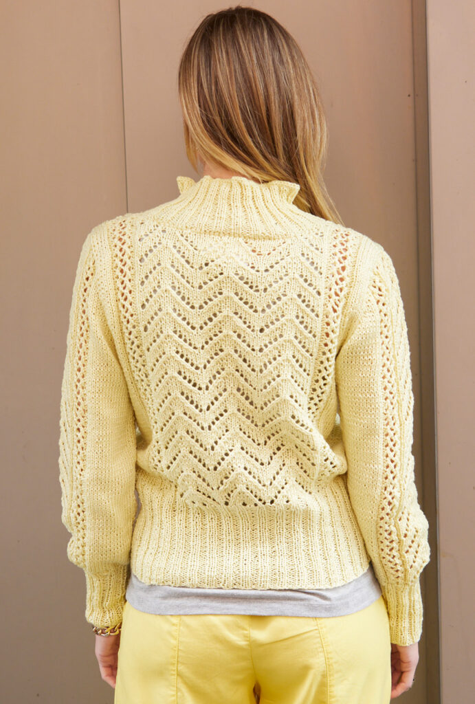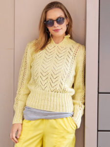 Dieser Pullover ist ein echter Hingucker, die Ajourmusterreihen an den Ärmeln und in der Pullovermitte ziehen alle Blicke auf sich. Der breite Bund sorgt für Tragekomfort und unterstricht den optischen Effekt des Musters. Aber nicht nur das fertige Stück ist ein absoluter Stricktraum. Auch das Stricken selbst ist mit diesem Pulli keine langweilige Angelegenheit. Das abwechslungsreiche Ajourmuster strickt sich, dank der drei detaillierten Strickschriften in der Anleitung, ganz fabelhaft und der zum Schluss angestrickte Reverskragen bringt noch mehr Strickspaß. Das angenehme Baumwollgarn gibt es bei LANGYARNS. Sowohl in Größe 36/38, 40/42 als auch 44/46 ein wunderbarer Alltagsbegleiter.