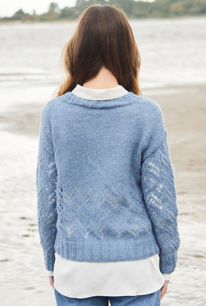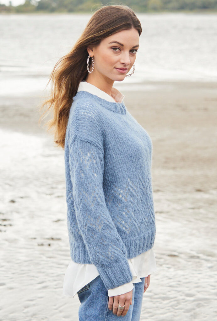 Manchmal muss es ganz klassisch sein. Was würde da besser passen, als dieser kuschlig-weiche Pullover. Die klassische Form wird durch das zarte Ajourmuster zauberhaft aufgelockert. Durch die überschnittenen Schultern und der gerade Schnitt kann man sich ganz auf das Muster konzentrieren. Die Umsetzung ist dank detailierter Strickschrift gar kein Problem. Alle Teile werden einzeln von unten nach oben gestrickt und zum Schluss zusammengenäht. Der Kragen ist, ebenso wie das Bündchen, besonders breit im Rippenmuster gearbeitet und sorgt für den perfekten Sitz des Pullovers. Gestrickt wird in Nadelstärke 5,5 mit doppeltem Faden. Das macht das Endergebnis in Größe 38/40 oder 44/46 noch viel, viel kuscheliger.