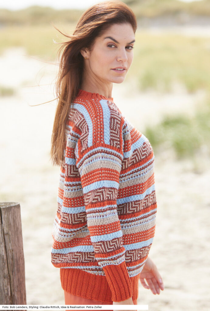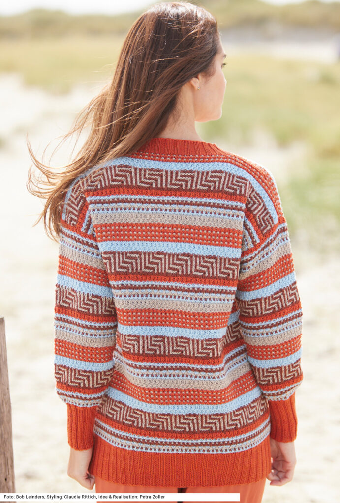 Bei diesem Pullover werden Geometrie-Fans strahlen – die Reihen und Formen geben dem Modell eine wunderbar klare Struktur, welche durch die unterschiedlichen Musterarten wie Tupf-, Perl- oder Treppenmuster aus Hebemaschen noch zusätzlich unterstrichen wird. Aber hier wird noch mehr geboten: Durch steten Wechsel der Farben und Muster wird es nie eintönig, denn die stricktechnische Abwechslung in Kombination mit angenehm zu verarbeitendem Garn aus reiner Schurwolle bietet ebenso viel Freude, wie es nach Fertigstellung das Ausführen des neuen Lieblingspullovers tun wird.