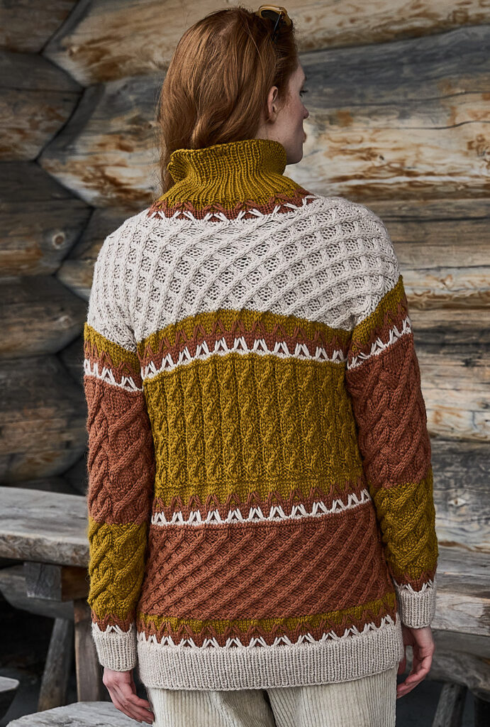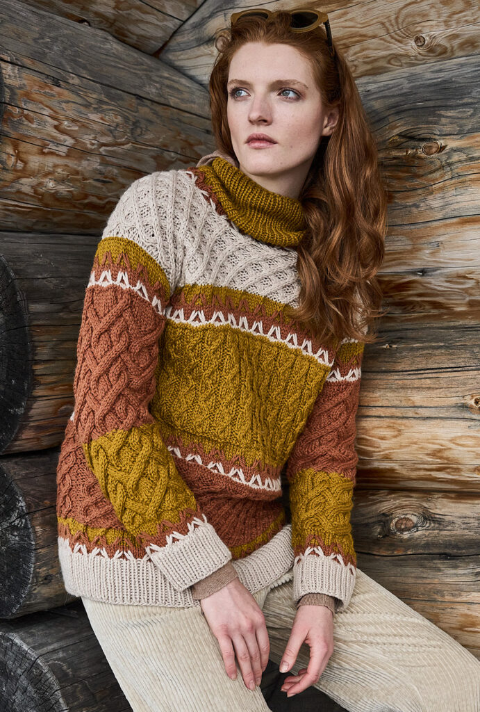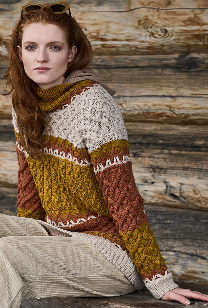 Die Natur ist unser liebster Rückzugsort und Muse der aktuellen Wintermaschen. So erinnert die Farbpalette bei diesem tollen Pullover an einen Spaziergang durch Wald und Flur: Rostbraun, Curry und Beige sind die Protagonisten und lassen durch ihre Vielzahl verschiedener Zopf- und Hebemaschenstrukturen das Herz kreativer Musterfans höher schlagen. Denn Stück für Stück wächst dieses Highlight und lässt beim Stricken keine Langeweile aufkommen. Elastische Rippenbündchen und der hohe Kragen bilden den perfekten Rahmen.