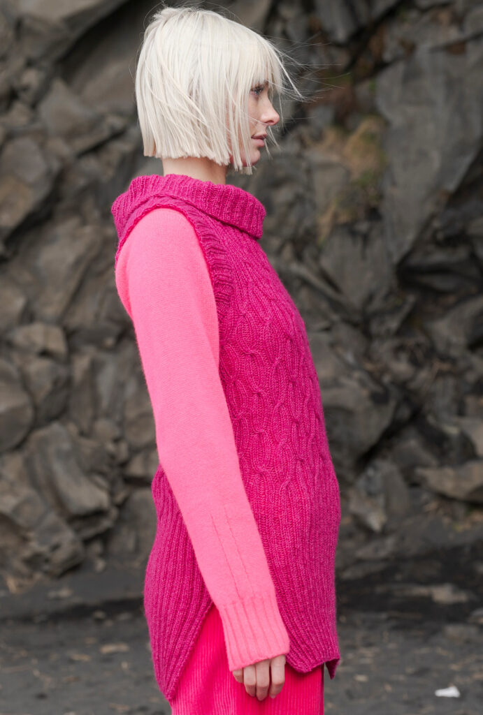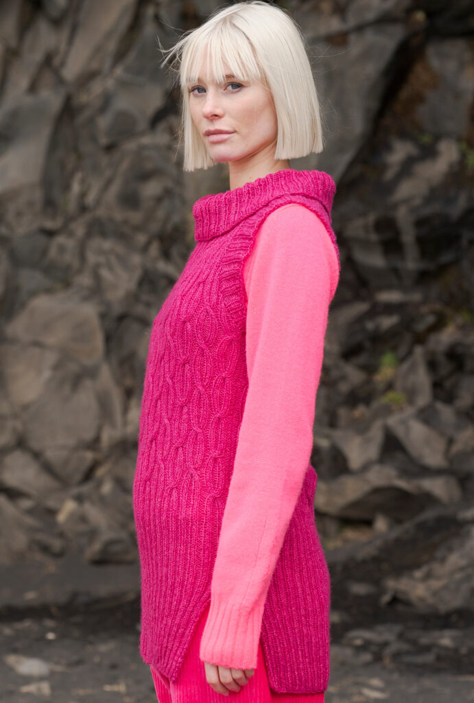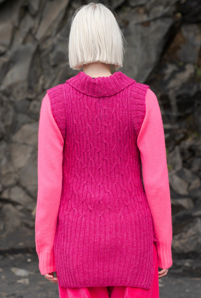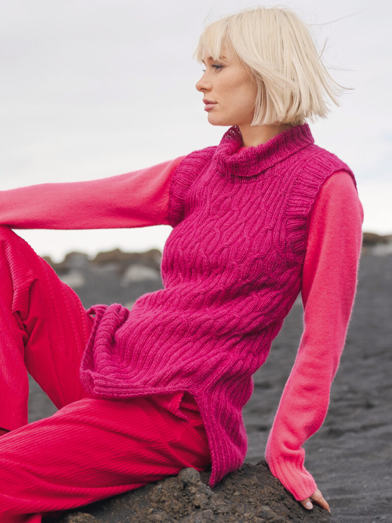 Schnörkelloses Design, klare Silhouette und puristische Ästhetik, das sind die Kennzeichen, die uns bei diesem hüftlangen Pullunder aus weichem Softgarm in den Bann ziehen. Das elastische Rippenmuster geht ab Taille in markante Flechtstrukturen über, für die wir in der Anleitung eine übersichtliche Strickschrift angelegt haben. Die Ärmelblenden werden durch verkürzte Reihen perfekt den Schultern angepasst, ein halsferner Kragen umschmeichelt die Halspartie. Weiteres Plus: Hohe Seitenschlitze garantieren Bewegungsfreiheit.