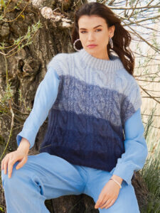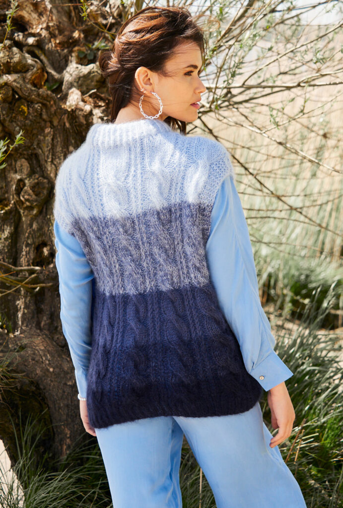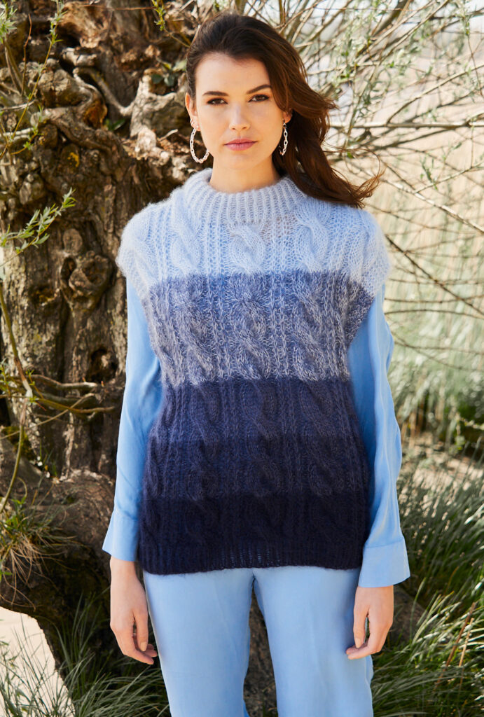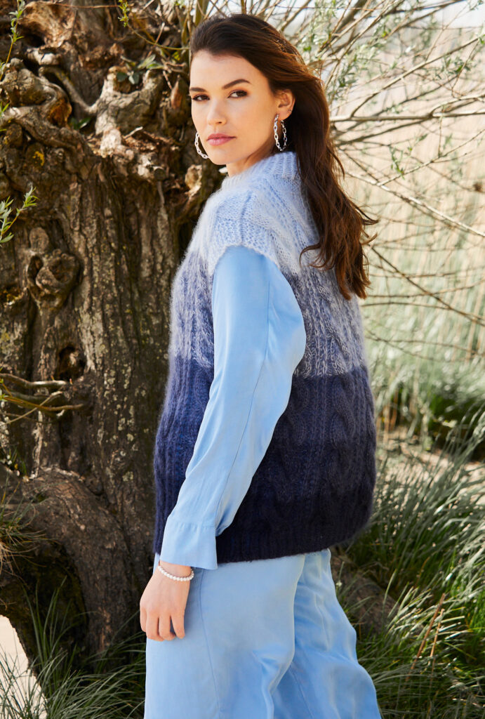 Dieser flauschige Pullunder aus edlem Mohair-Seide-Mischgarn zeigt Blau in all seinen Facetten – von dunklem Marineblau, über Mittelblau bis Hellblau. Er wird zweifädig gestrickt, die drei verwendeten Farben dabei jeweils unterschiedlich kombiniert, sodass ein Verlauf entsteht. Das Zopfmuster gepaart mit Patentstreifen zieht sich durch alle Farben durch. Das Rippenmuster des Bunds und der Blenden wird 1 Masche rechts verschränkt, 1 Masche links gearbeitet. Gerade gestrickte Teile ergeben überfallende Schultern. Die Anleitung gibt es für die Größen 36 – 40, 42 – 46 und 48 – 52.