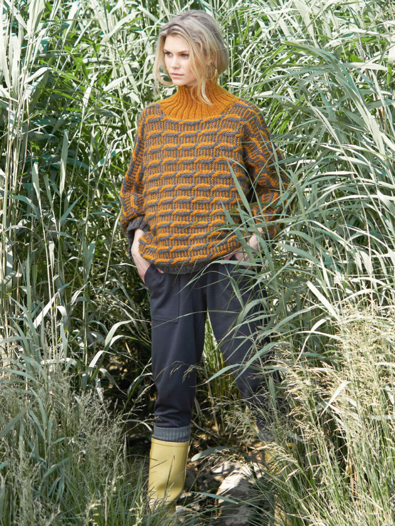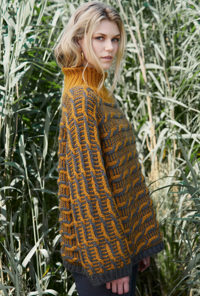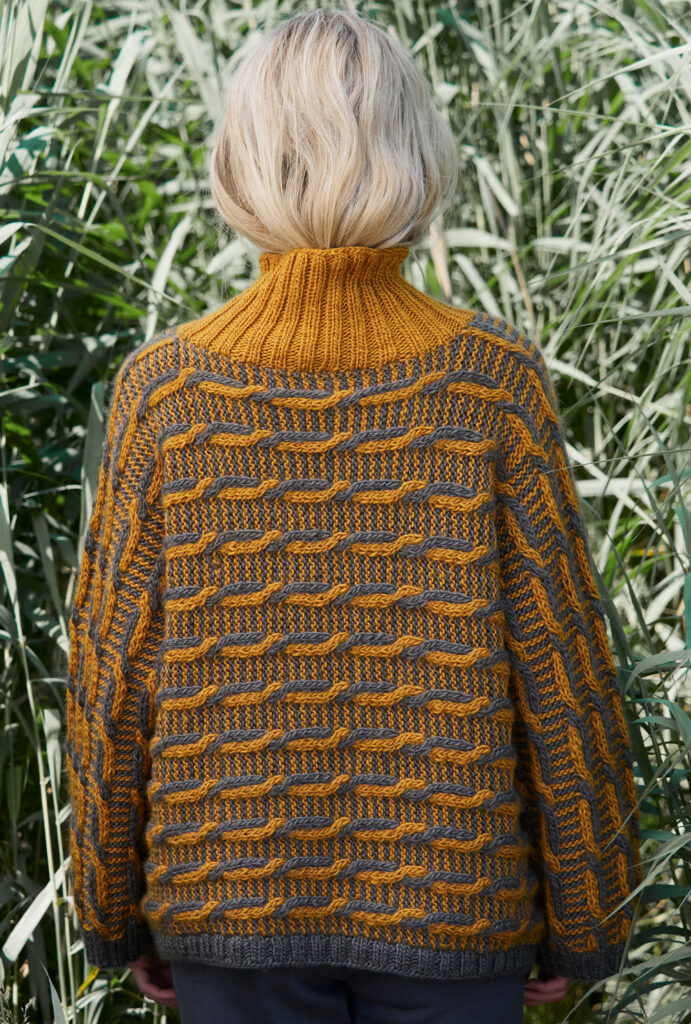Bei diesem zweifarbigen Pulli legen sich die Hebemaschen-Strukturen quer, da von Ärmel zu Ärmel gestrickt wird. Das geht ganz einfach, man sollte aber wegen des hohen Maschen-Aufkommens mit einer langen Rundstricknadel arbeiten. Der schmale Bund in Grau wird nachträglich angestrickt, genau wie auch der ockerfarbene Turtleneck-Kragen, der sich elegant um den Hals legt. Saum- und Ärmel-Bündchen in Grau und auch der Kragen in Ocker werden mit Rippen zwei rechts, zwei links gearbeitet. Eine Anleitung steht für die Größen 38/40 und 44/46 bereit.