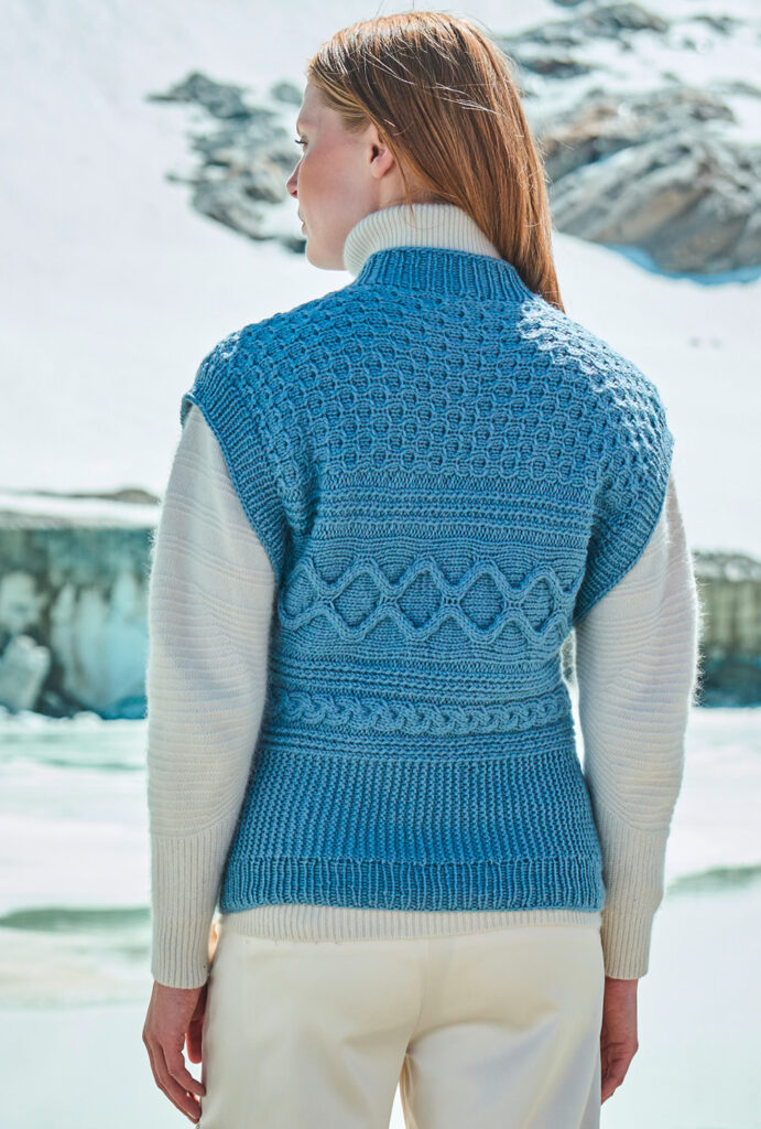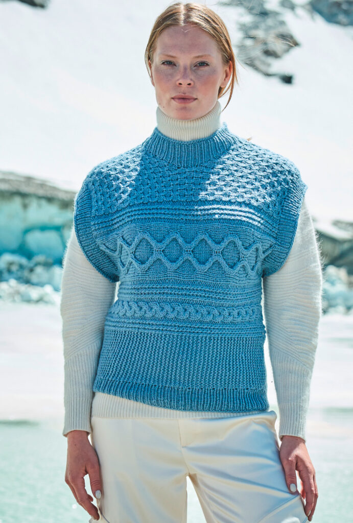 Rauten, Zöpfe und Rippen im Schulter- und Brustbereich sorgen für die mustergültige Optik dieses quer gestricken Pullunders. Unten sorgen Kraus-rechts-Streifen für die leichte Taillierung, da sie sich in der Höhe leicht zusammenziehen – ein raffinierter Trick, bei dem man auf seitliche Abnahmen verzichten kann. Die Bündchen und Blenden – außer an den Ärmeln – werden im Rippenmuster angestrickt und bilden den formstabilen Rahmen. Die mit Alpaka verwebte Schurwolle erzeugt nicht nur die weiche Haptik, sondern lässt die Muster auch toll zur Geltung kommen.