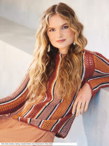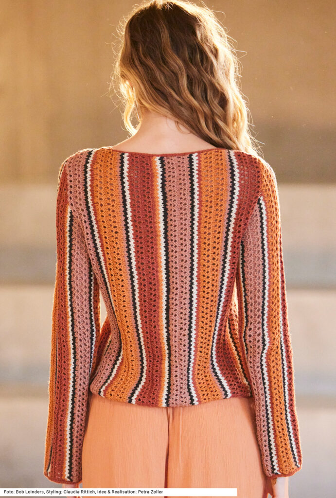 Dieser Pullover bekommt seine Dynamik, durch vertikale Streifen in vier Farben. Alle Teile des Pullis werden quer gestrickt, wobei in Vorder- und Rückenteil die Längsstreifen mit Loch- und Jacquardmuster eine schmale Silhouette zaubern. Ärmel mit Armkugel ergeben einen perfekten Sitz an den Schultern. Der U-Boot-Ausschnitt und die Ärmelränder werden zum Schluss mit einem I-Cord-Rand verziert. Das Modell wird mit einem Garn aus Baumwolle und Viskose gearbeitet. Eine Anleitung steht in den Größen 36/38, 42/44 und 46/48 zur Verfügung.