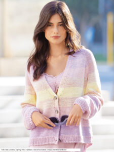 Diese Raglanjacke aus reiner Baumwolle ist kontrastreich, aber ohne harte Brüche, denn die Streifen gehen harmonisch ineinander über. Da das Modell doppelfädig in den drei Farben Rosa, Lila und Gelb gestrickt ist, werden die Streifen mal uni, mal mit je einem Faden von zwei aufeinanderfolgenden Farben gearbeitet, sodass dadurch melierte Streifen entstehen. Die geraden weiten Ärmel gehen bis über die Schulter hinweg weiter. Die mitgestrickten Vorderteilblenden laufen über den rückwärtigen Halsausschnitt weiter. Eine Anleitung steht für die Größen 36/38, 40/42 und 44/46 zur Verfügung.