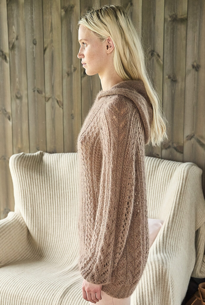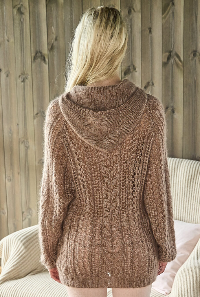 Dreifädig verarbeitet erhält feines Lacegarn das nötige Volumen um den einzigartigen Mustermix auf beeindruckende Art und Weise zur Geltung zu bringen. Und es entsteht ein ansprechender Melange-Effekt, den es so nicht von der Stange zu kaufen gibt. Bei der Einteilung der verschiedenen Ajourstrukturen heißt es allerdings aufgepasst, aber mit ein bisschen Übung gelingt sie auch dir. Modisches Detail sind die langen Ärmel und die glatt rechts gestrickt Kapuze, die sich weich und warm um den Hals legt.