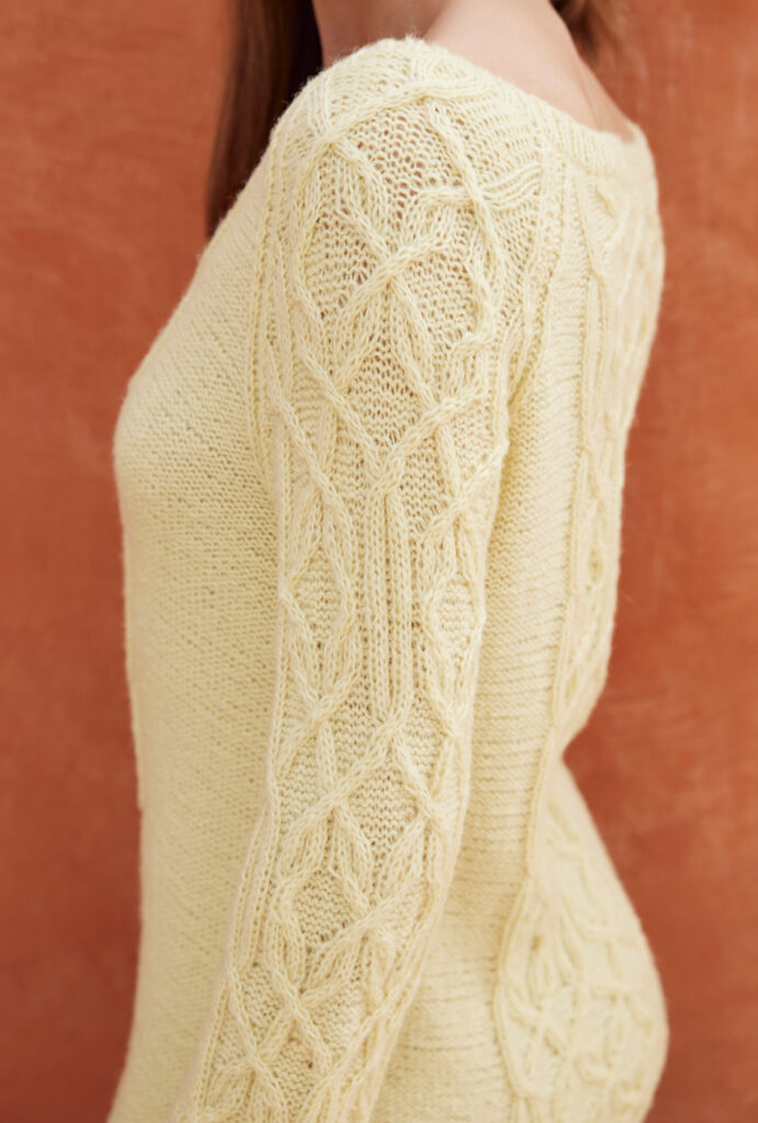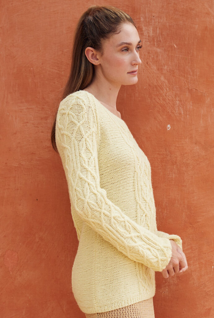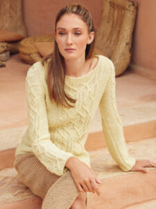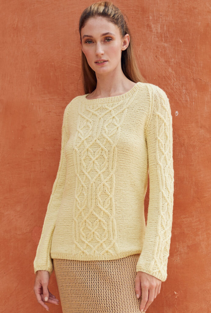 Gerade in der Übergangszeit spielt das Wetter manchmal verrückt. Wir haben deshalb für diesen Raglanpulli ein Baumwollgarn ausgewählt, das mit Seide und Alpakawolle angereichert auch an kühleren Tagen zum Einsatz kommt. Für die markanten Zopfstrukturen haben wir eine übersichtliche Strickschrift angefertigt, die dir die Arbeit erleichtert. Eingebettet sind diese Zöpfe in ruhigen Glatt-links-Flächen, die umso schneller von der Nadel gehen. Schmale Rippenbündchen und -blenden bilden den klassischen Rahmen und halten alles schön in Form.