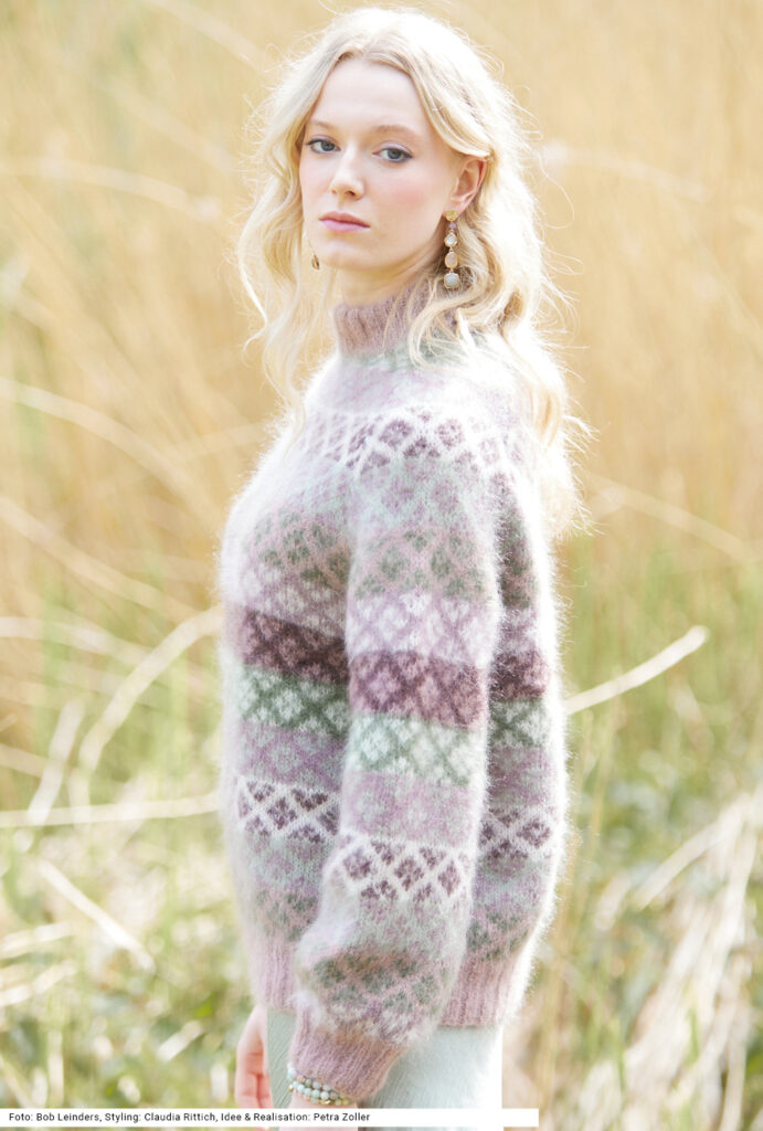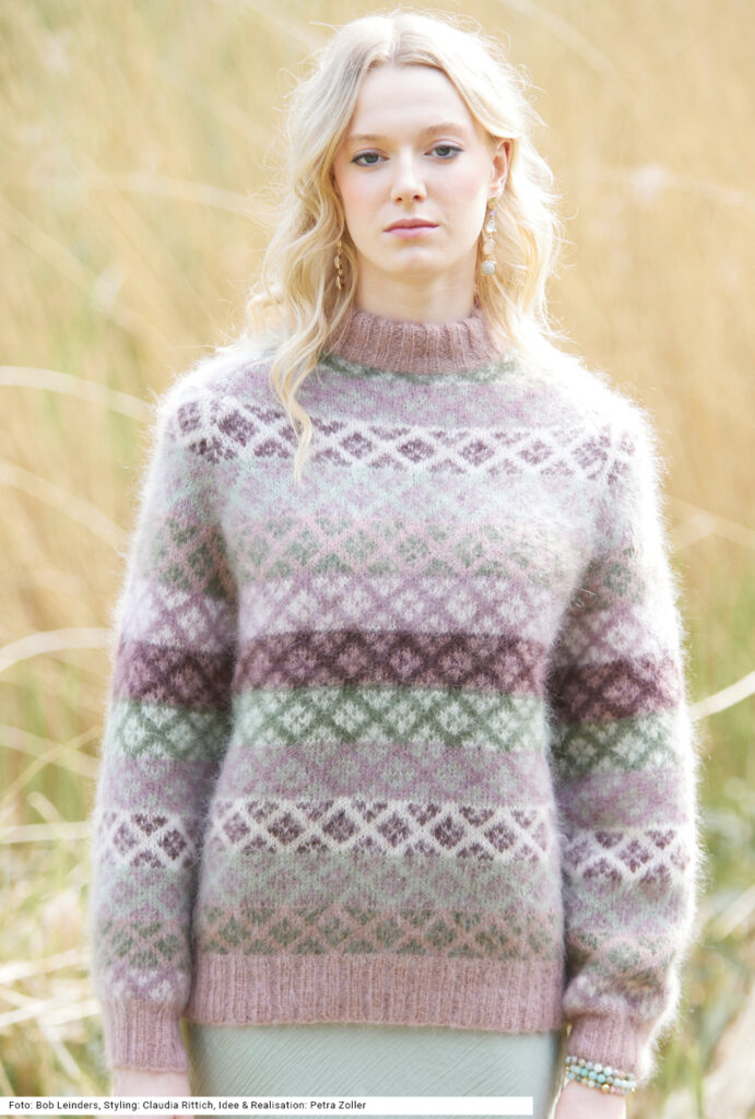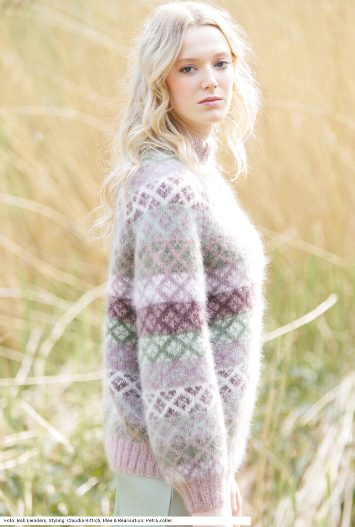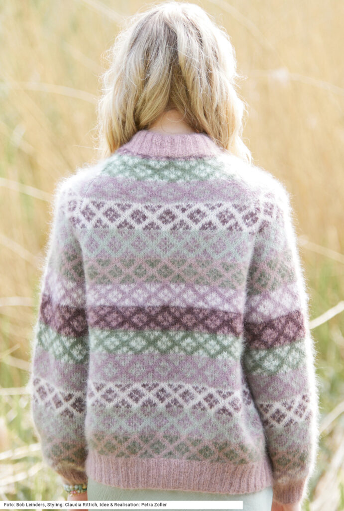 Dieser Pulli aus einem wunderbar flauschigen Mohair-Seide-Garn ist etwas aufwändiger zu stricken, jedoch aller Mühe wert. Das klassische nordische Jacquardmuster wird in sechs Farben glatt rechts gearbeitet, die unterschiedlich kombiniert, aber immer im gleichen Muster gestrickt sind. Denn die Farben Rosa, Altrosa, Natur, Hellgrün, Bordeaux und dunkleres Grün erzeugen ein spannendes, farblich überaus harmonisches Gesamtbild, die Rautenform sorgt für das passende Gegenwicht zur Streifenstruktur. Ein ziemlich hoher Raglan sorgt für komfortable Bequemlichkeit. Die Bündchen sind im 2/2-Rippenmuster gestrickt. Eine Anleitung steht in den Größen 38/40, 42/44 und 46/48 zur Verfügung.