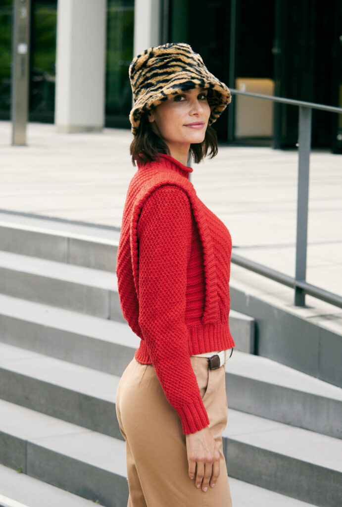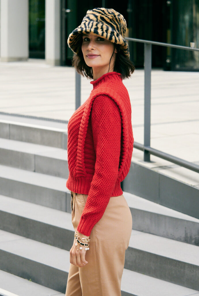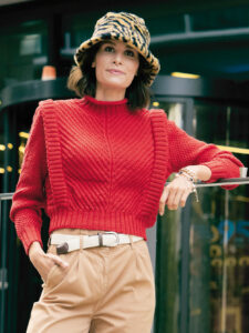 So vielfältig wie bei diesem taillenkurzen Pullover aus reiner Schurwolle sieht man Rechts-Links-Muster selten: An den Seiten verlaufen die Rippen quer, in der Mitte schräg nach oben und beim Bund, der Halsausschnittblende und den längs angebrachten Rippenblenden als 2/2-Rippen. Die Ärmel sind bis auf den Bund im großen Perlmuster – also ebenfalls ein Rechts-links-Muster – gearbeitet. Die über die Schulter hinweg angestrickten breiten Rippenblenden verdeckten die Armkugeln, die für die perfekte Passform des Pullis an den Schultern sorgen. Eine Anleitung dazu steht in den Größen 36/38, 40/42 und 44/46 zur Verfügung.