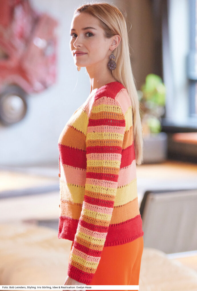 Dieses Set aus reiner Bio-Baumwolle ist perfekt für den Alltag – die bunte Jacke mit Ajourmuster-Ärmeln sorgt für eine fröhliche Note. Das klassisch geschnittene Top in Rot hingegen bringt wieder etwas Ruhe in den Look und macht ihn so bürotauglich. Das Garn ist übrigens bei 60 Grad waschbar. Die Streifen der Jacke von Rot, Orange, Gelb und Lachs werden glatt rechts gestrickt, der Farbübergang wird als Lochstreifen gearbeitet. Der tiefe V-Ausschnitt und die Armausschnittränder des Tops bekommen zum Schluss einen Rollrand. Eine Anleitung für das Set gibt es für die Größen 36/38, 40/42 und 44/46.