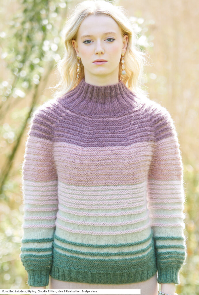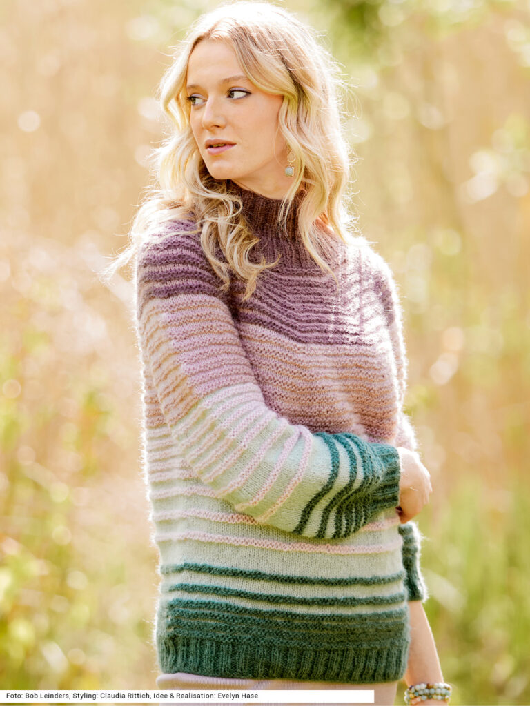 Bei diesem Rundpassen-Pulli mit Strukturstreifen braucht nichts zusammengenäht zu werden – er wird nämlich von oben nach unten nahtlos an einem Stück gearbeitet. Dabei kommen insgesamt fünf Farben zum Einsatz, die sich wunderbar ergänzen und dem Modell einen sanften, femininen Charakter verleihen. Die plastische Wirkung entsteht durch glatt rechts gestrickte helle Farben wie Altrosa, Rosa und Hellgrün und glatt links gestrickte dunklere Farben – hier zusätzlich noch Dunkelrosa und Grün. Dazu eignet sich ein weiches Alpaka-Polyamid-Schurwolle-Garn. Die Anleitung gibt es in den Größen 36/38, 40/42 und 44/46.