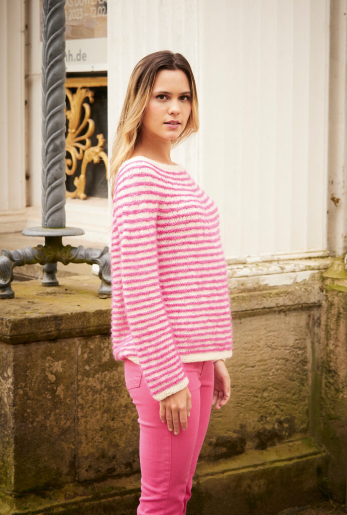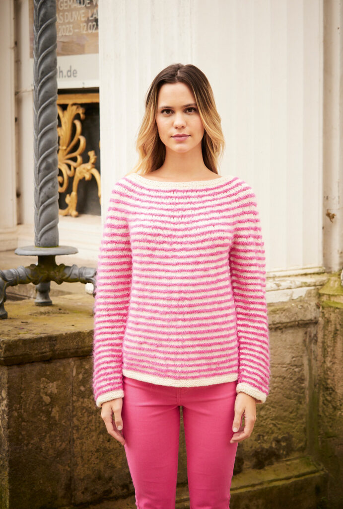 Der von oben nach unten in einem Stück gestrickte Pulli wirkt dank des Farbkontrasts zwischen Pink und Weiß besonders leuchtend. Auch die Ärmel werden in Runden gleich weitergearbeitet, sodass keine Nähte entstehen. Sehr interessant sind die Garne: Das wollweiße Bändchengarn aus Schurwolle-Polyamid wird glatt rechts gestrickt und wechselt sich mit dem kraus rechts gestrickten pinkfarbenen Flauschgarn aus Alpaka-Schurwolle ab. Gearbeitet wird mit einer 6er-Nadel (Bündchen mit 5,5), sodass schnelles Vorankommen garantiert ist. Ein tiefer, runder Halsausschnitt macht ein schönes Dekolleté. Die Anleitung kann in den Größen 36/38, 40/42 und 44/46 downgeloadet werden.