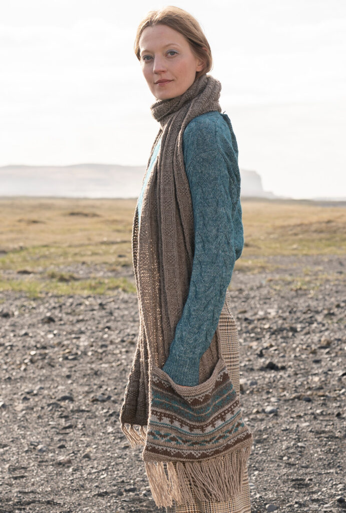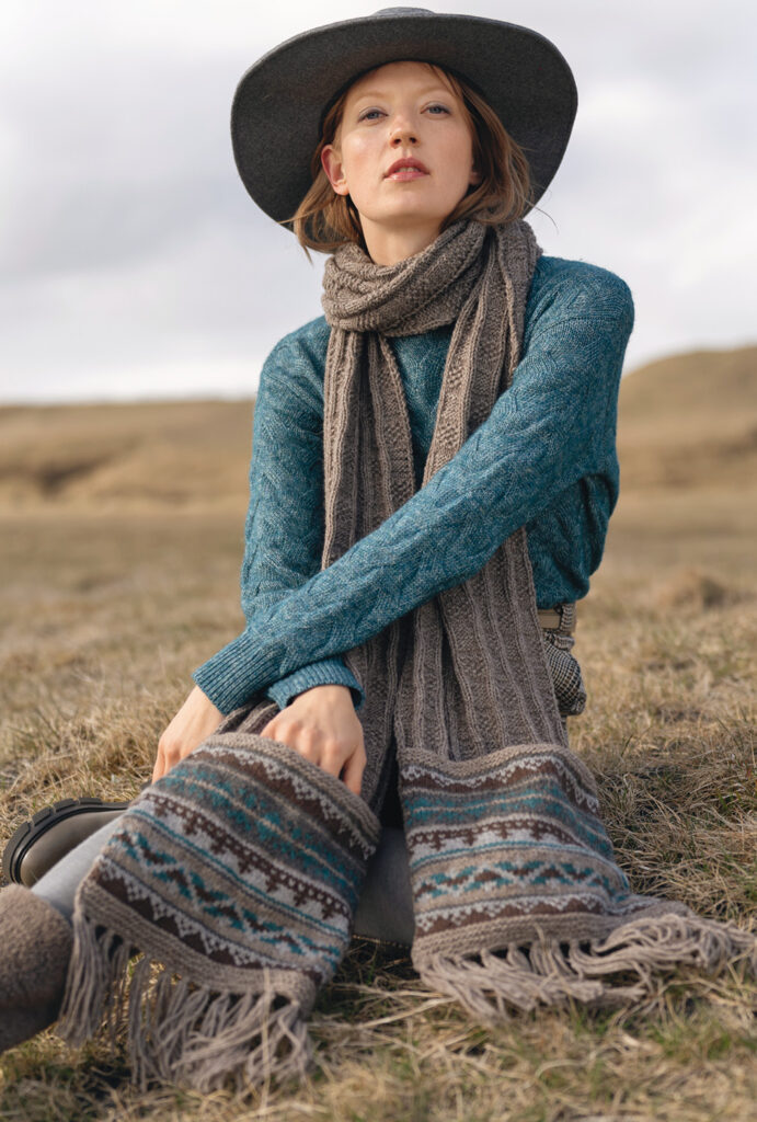 Im Herbst geht nichts über wärmende Accessoires. Wie dieser lange Schal, der durch ein einfaches Kästchenmuster aus rechten und linken Maschen entsteht. Für die separat gestrickten Jacquardmusterbordüren findest du in unserer Anleitung ein farblich angelegtes Zählmuster. Sie dienen als Taschen und werden auf die Schalenden genäht. Zum Schluss komplettieren eingehäkelte Fransen den rustikalen Outdoor-Look, der sich in warmer Schurwolle mit hohem Anteil an Yak-Fasern präsentiert.