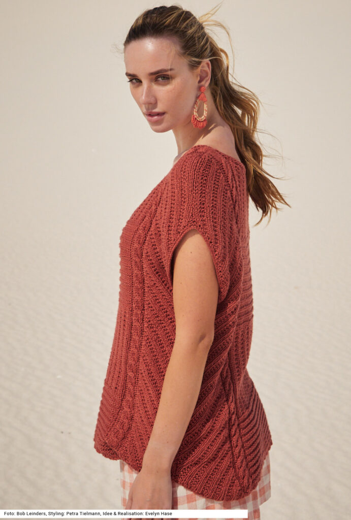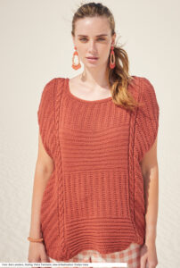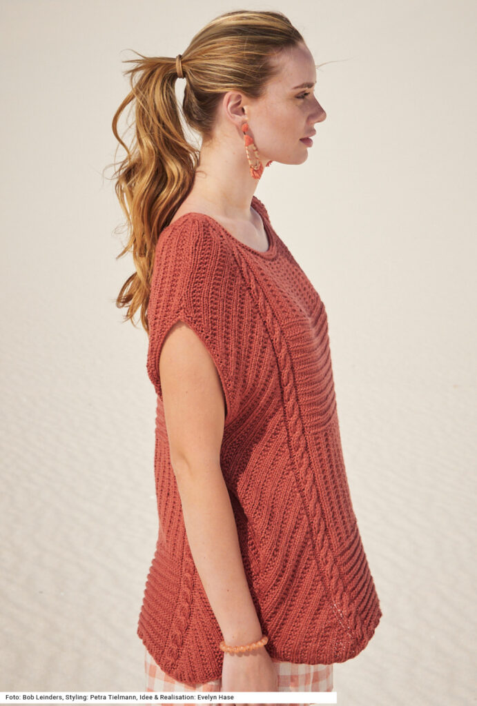 Bei diesem ärmellosen Mustermix-Shirt aus reinem Baumwollgarn kommt garantiert keine Langeweile auf. So viele Muster – Rechts-links-Muster, mal quer, mal längs, mal diagonal und Zöpfe – werden das Herz einer jeden StrickerIn erfreuen. Dazu kommt ein unkomplizierter, eckiger, gerader Halsausschnitt und schräge, überfallende Schultern, die etwas üppigere Oberarme geschickt kaschieren. Gearbeitet ist dieses weit geschnittene Modell aus reinem Baumwollgarn in Braun. Für den Bund werden ein paar Reihen im 2/2-Rippenmuster und für die Halsausschnitt- und die Armausschnittblenden zwei Runden glatt links gestrickt. Die Anleitung steht für die Größen 36/38, 40/42 und 46/48 bereit.