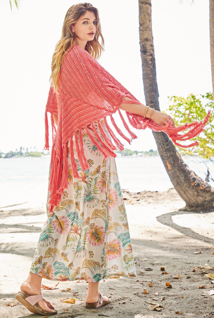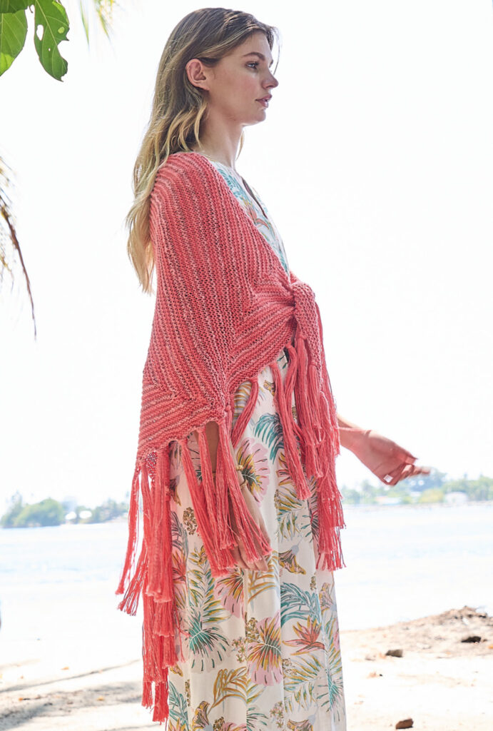 Tücher sind tolle Accessoires, die nicht nur wärmen, sondern auch schmücken. Dieses entsteht aus drei verschiedenen Garnen, die zu Dreiecken verstrickt werden. Dann nach der Schemazeichnung zusammennähen und mit langen Fransen verzieren – fertig ist das neue Lieblingsstück für den Sommer! Kraus rechts mit Nadelstärke 4,5 gestrickt, geht das auch noch ganz schnell und einfach – und für ein tolles Tragegefühl und den schönen Fall sorgen Garne aus Leinen, Viskose und Baumwolle.
