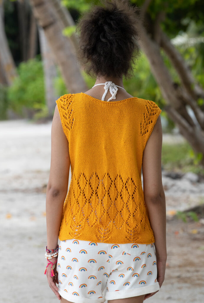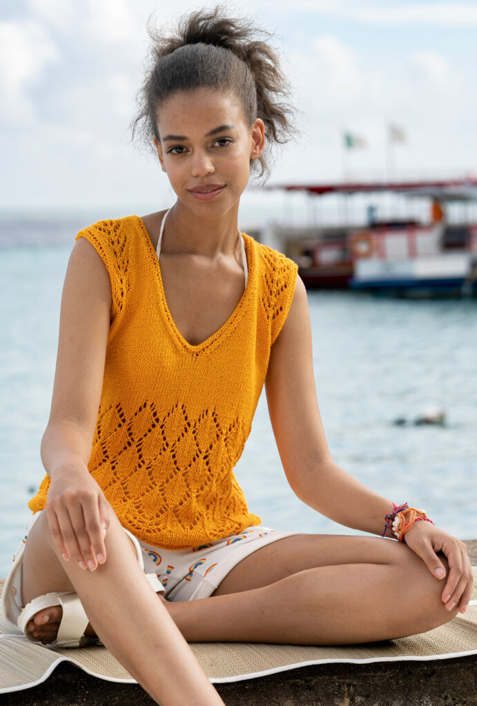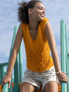 Der Sonne entgegen: Mit diesem hübschen Sommertop in leuchtendem Gelb-Orange, in dem sich jeder Tag wie Urlaub anfühlt. Und sogar der Name des ökologischen Baumwollgarns macht da mit, es heißt «Sunshine», und lässt die fantasievolle Anordnung von Ajourästen und Rautenmotiven toll zur Geltung kommen. Besonders schön: die sichtbaren Minderungen am V-Ausschnitt und an den Armausschnitten, die in unserer Anleitung genau erklärt werden.