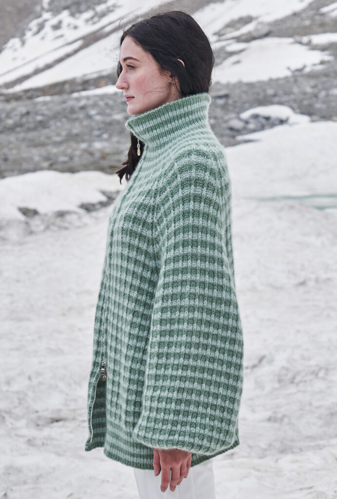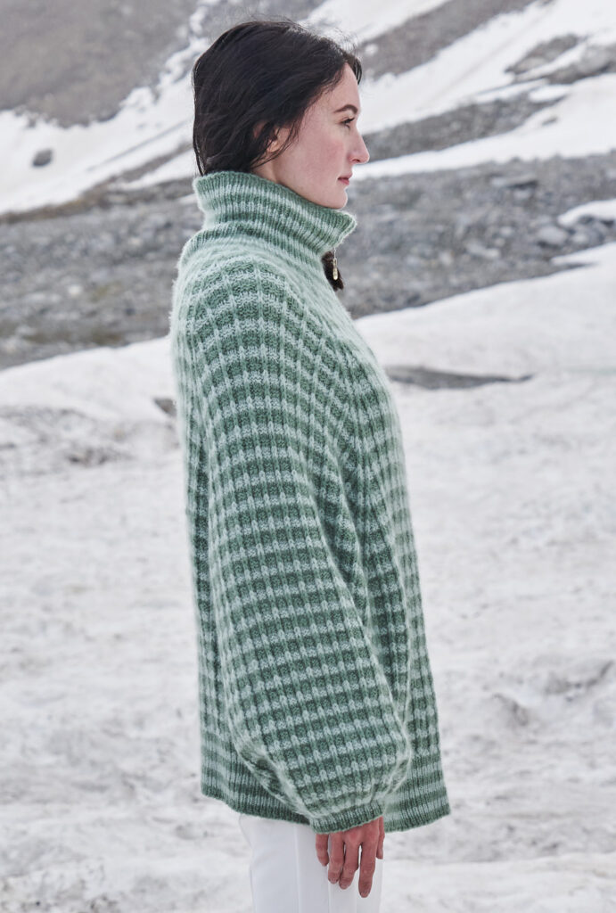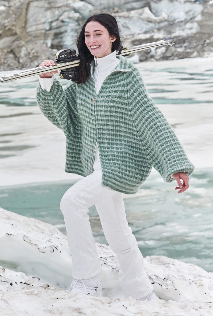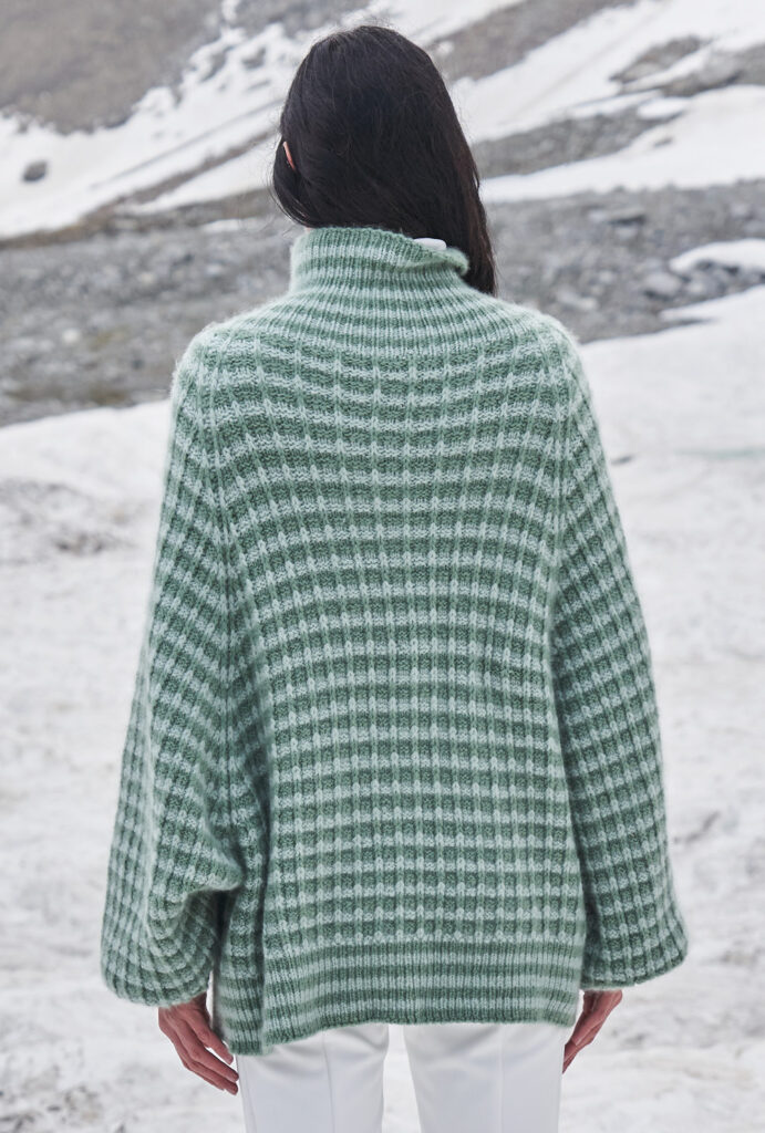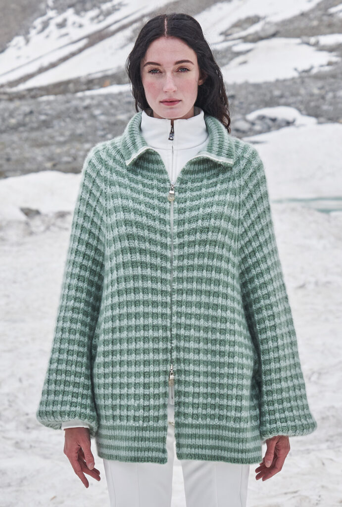 Top-Down-Modelle, also Strickstücke, die von oben nach unten genadelt werden, sind unter Maschenfans die absoluten Highlights. Hier als Jacke, deren Raglanschrägungen sehr tief angesetzt sind und dadurch die extravagante Silhouette entstehen lassen. Besonders schön: Die Kombination von Mint und Eis in der Streifenfolge im Zusammenspiel mit dem Strukturmuster aus tiefer gestochenen Maschen. Diese rücken die edle Schönheit des weichen Kaschmirgarns bei jeder einzelnen Masche geschickt in den Fokus. Gestrickt wird erst der Kragen, dann die Raglanpasse, gefolgt vom Körperteil in einem Stück und von oben nach unten. Im Anschluss werden die zuvor stillgelegten Maschen für die Ärmel wieder aufgenommen und auch diese von oben nach unten gestrickt. So lässt sich die Jacke zwischendurch immer mal wieder problemlos anprobieren, die Passform kontrollieren und gegebenenfalls die Länge anpassen.