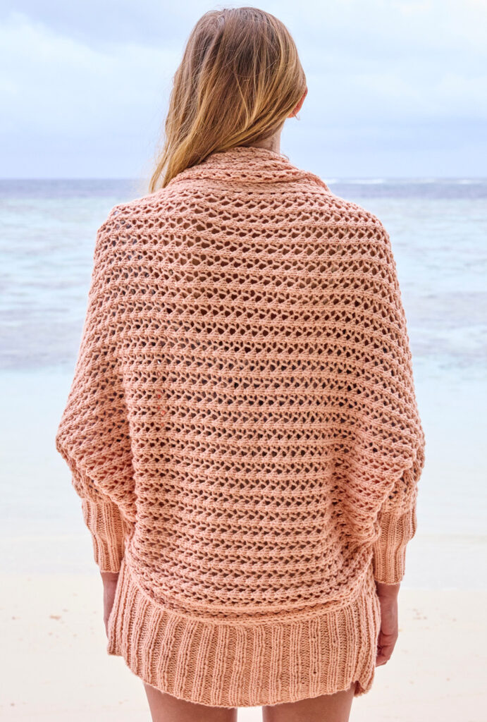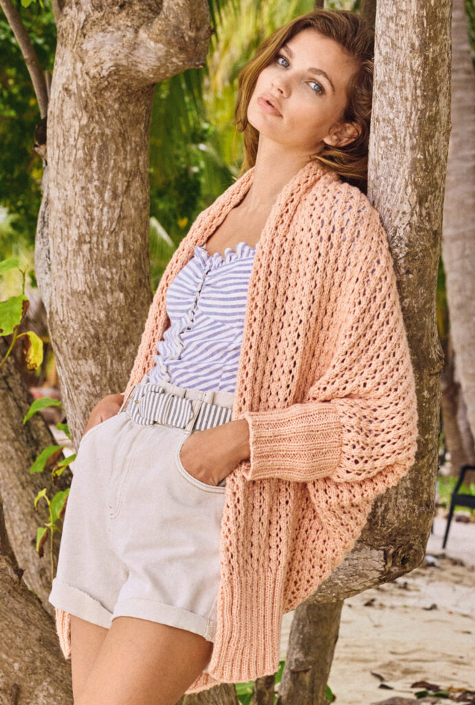 Seelenwärmer nennt man Jacken, die nur aus einem Rechteck bestehen, zum Schluss zusammengenäht und mit einer Rippenblende in Form gebracht werden – easy going! Erst werden Vorderteil, Rückenteil und Ärmel in einem Stück quer gestrickt. Mit Nadelstärke 6 im unkomplizierten, Reihe für Reihe beschriebenem Ajourmuster geht das ganz fix. Dann wird der Schalkragen gestrickt – erst im Rippenmuster, dann im Lochmuster, den Abschluss bildet wieder das Rippenmuster. Danach bekommen noch Vorder- und Rückenteil ihr Bündchen, die Nähte werden geschlossen, die Ärmelbündchen angestrickt und der Schalkragen angenäht – fertig ist der trendige Cardigan.