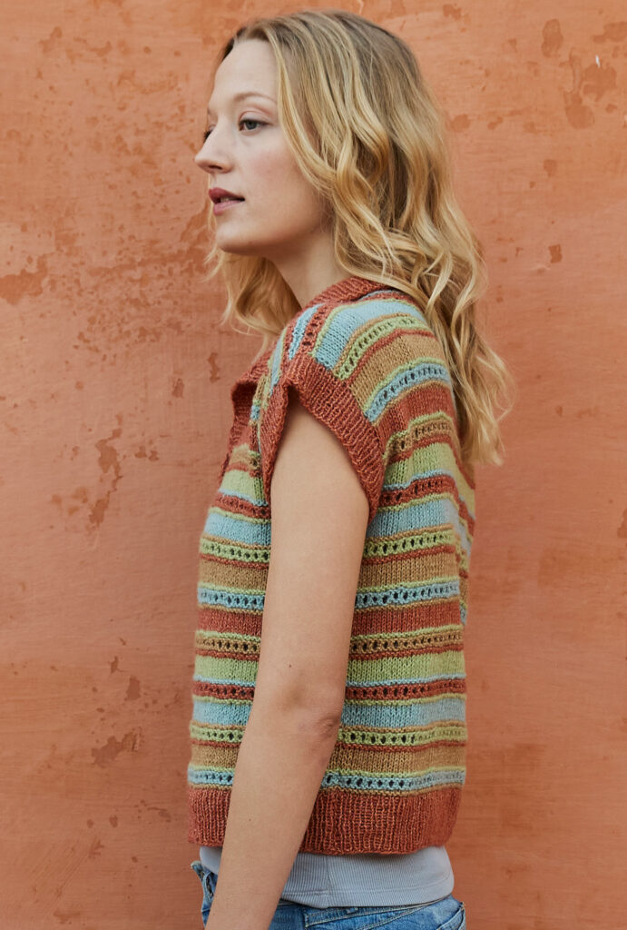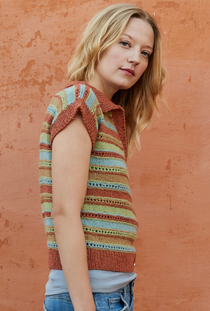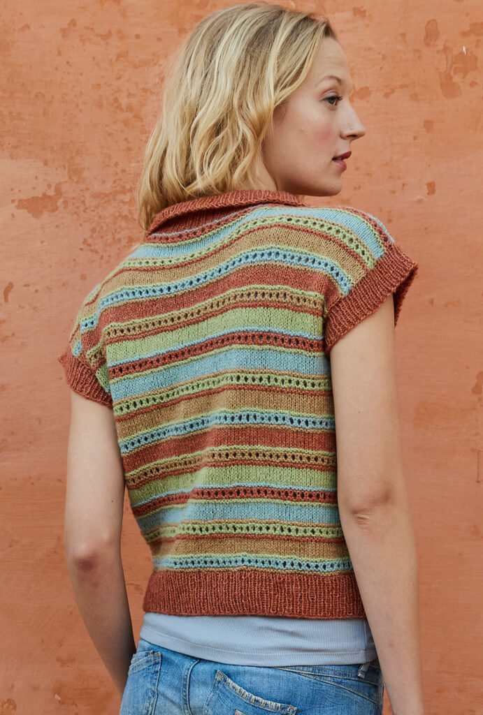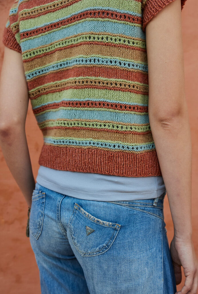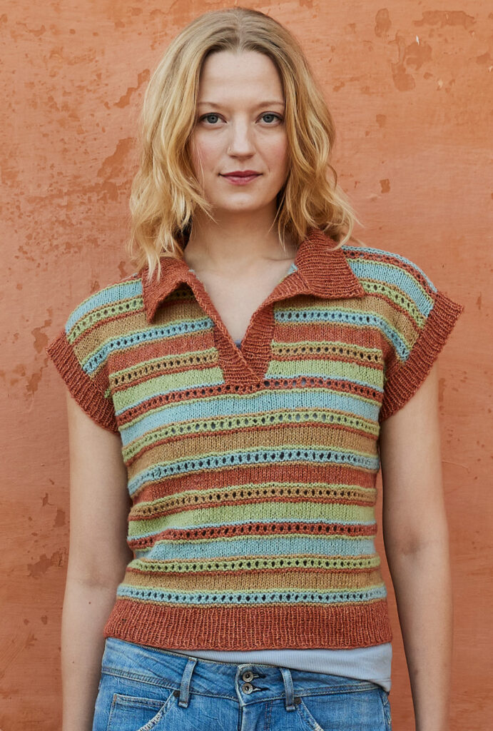 Zu stylischen Bootcut-Jeans der ideale Partner: das gestreifte Stricktop mit Polokragen. Rost, Beige, Hellblau und Grün fügen sich hier zu einem harmonischen Streifenspiel aus Glatt-rechts-Flächen und Lochreihen zusammen. Zum Schluss wird alles mit elastischen Rippenblenden in Form gebracht, der Polo-Schlitz kommt ohne Knöpfe aus. Durch das weiche Baumwoll-Mischgarn, das durch Seide und Alpaka ergänzt wird, entsteht die softe Haptik, die uns das ganze Frühjahr begleiten wird.