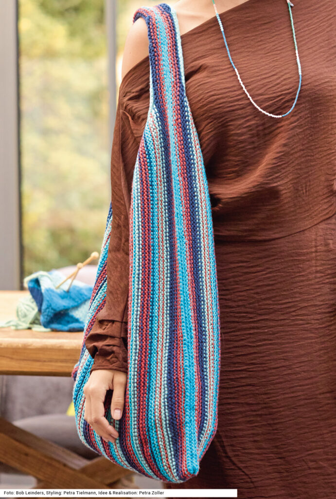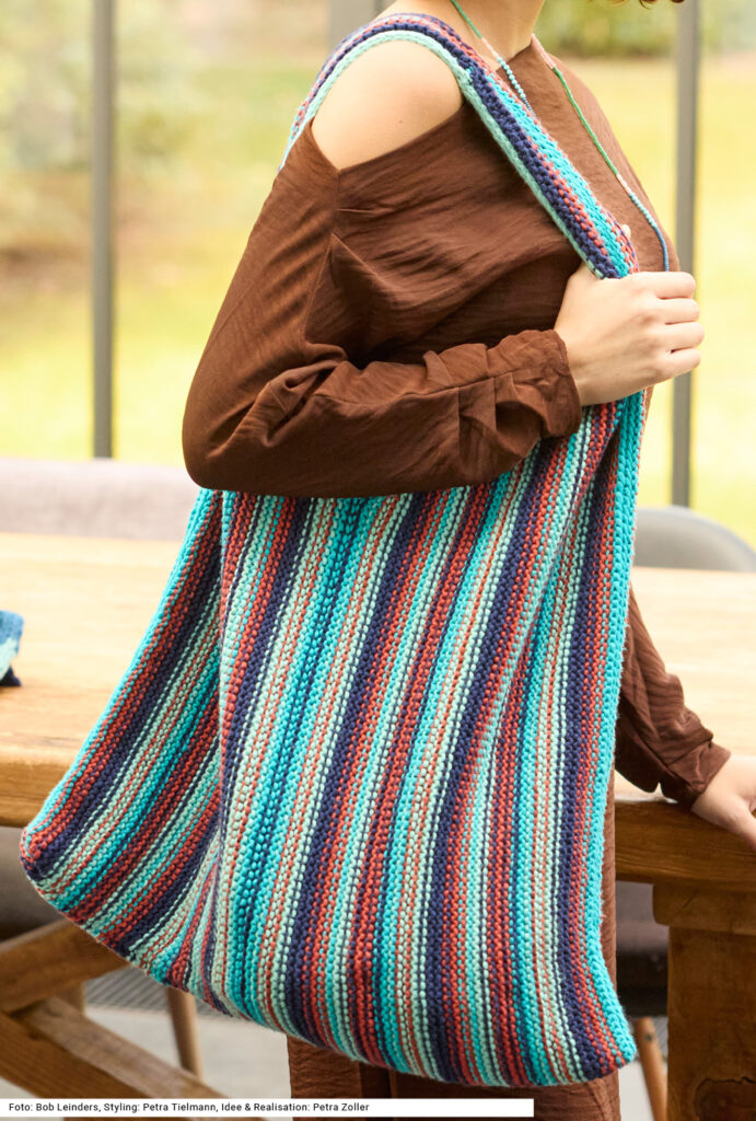 Maximale Größe bedeutet hier auch maximalen Strickspaß. Diese Tasche aus reiner Baumwolle ist ein Multitalent: Dank der frischen Farbtöne macht sie sich perfekt als Freizeitbegleiter und passt zu vielen Gelegenheiten, auch zu einem klassischen Büro-Outfit. Das quer gestrickte Modell wird kraus links in zwei Teilen inklusive Henkel gearbeitet. Nach dem Zusammennähen wird der Henkel und die obere Öffnung beidseitig mit einem I-Cord umrandet. Eine Anleitung ist für eine Tasche mit50 x 65,5 cm vorhanden.