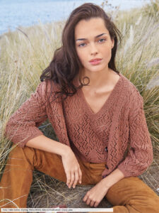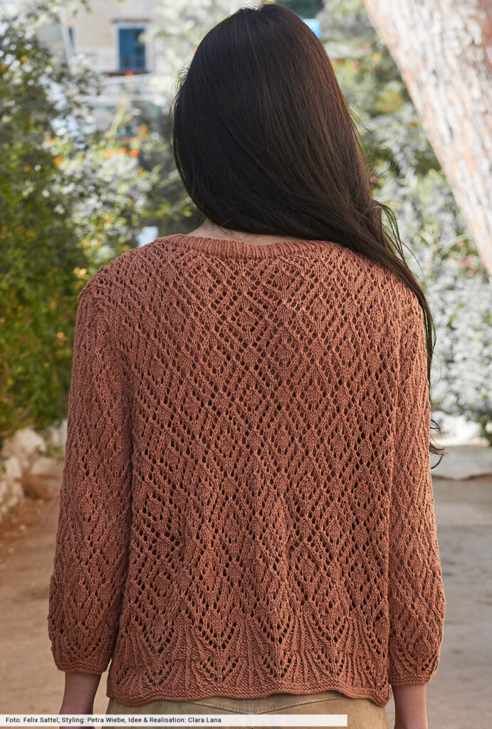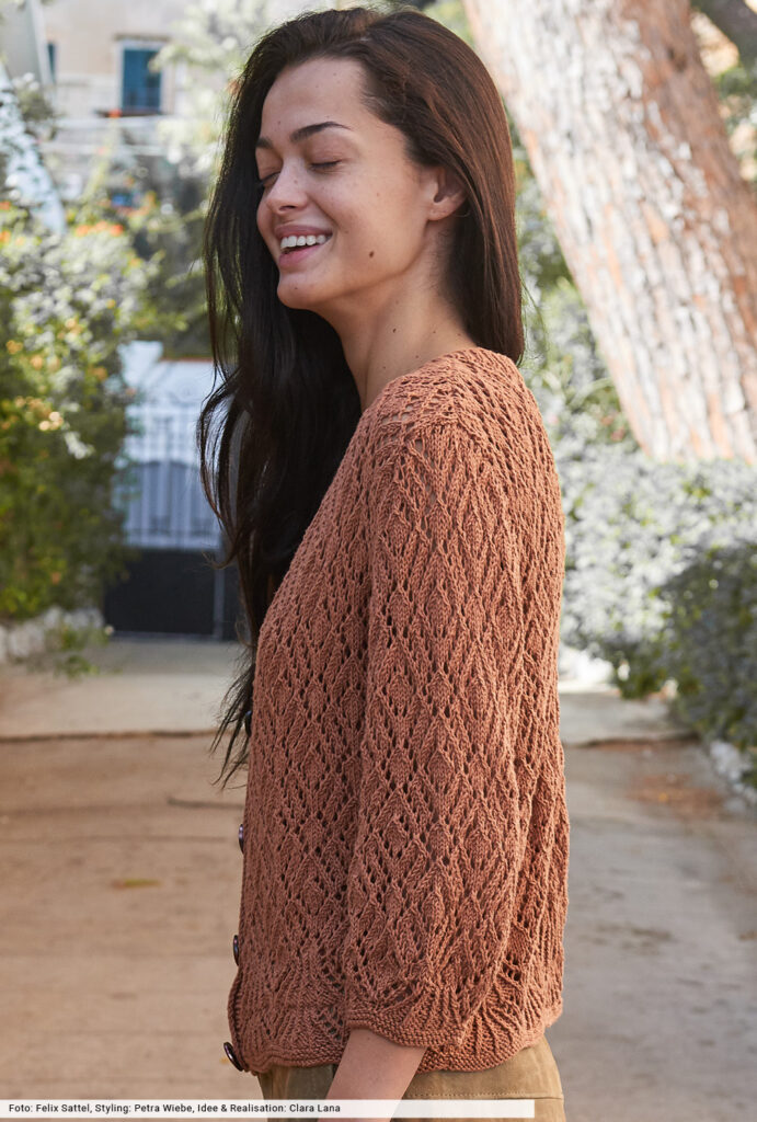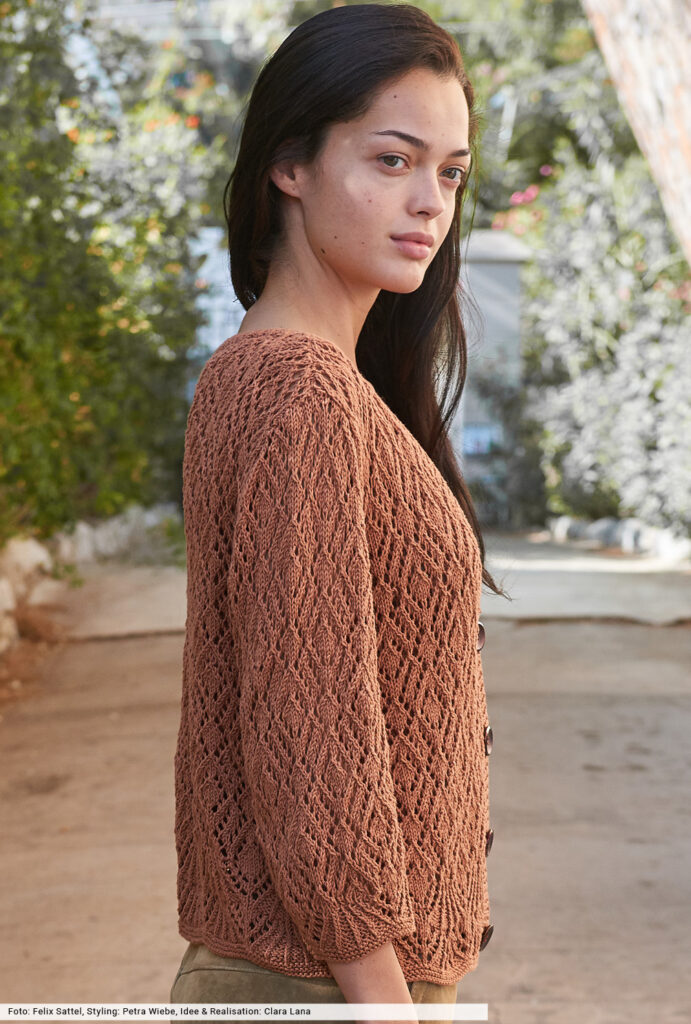 Mal kälter, mal wärmer – zu dieser Jahreszeit zeigt sich das Wetter immer wieder sehr wechselhaft. Wie gut, dass es Twinsets gibt! Dieses besteht auf einem Top und einer Jacke, die beide in einem ausdrucksstarken Ajourmuster überzeugen. Schmale Rippenbündchen und rötlich schimmernde Knöpfe bilden das stilvolle Finish. Höchsten Tragekomfort bietet das Garn, bei dem zu edler Baumwolle schimmernde Viskose beigefügt wurde.