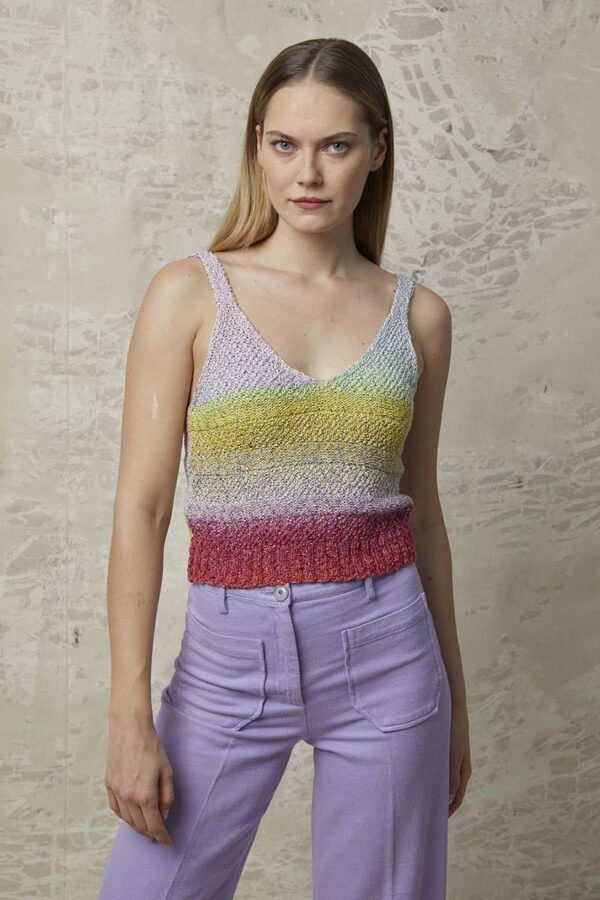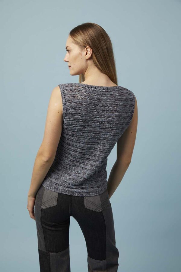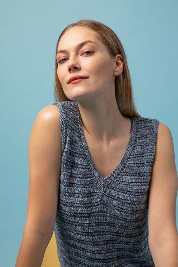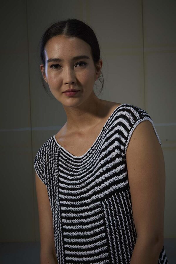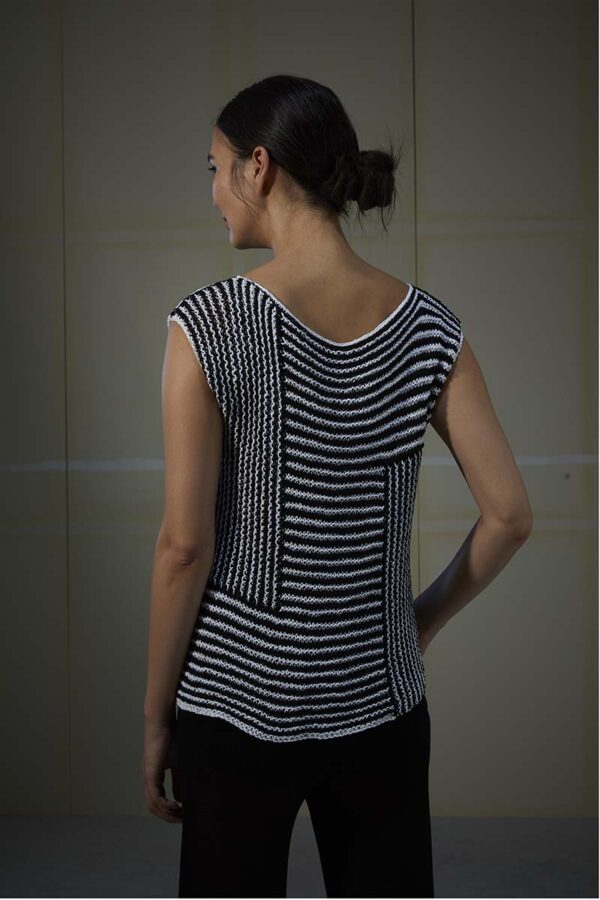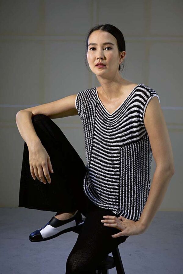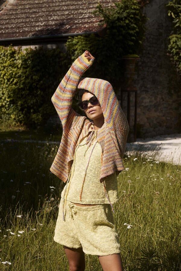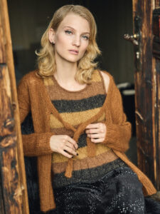 Der Metallic-Trend sticht in dieser Saison besonders hervor. Hier gibt es jetzt im Fachhandel jede Menge Glanzgarne oder Lurexfäden, mit denen sich tolle Effekte erzielen lassen. Bei dem gestreiften Top kommt edle Mohairseide zum Einsatz, die wir mit Lamé-Beilaufgarn auf Hochglanz gebracht haben. Die Jacke mit Bindeband begeistert durch feines Flauschgarn, bei dem die Glitzereffekte bereits eingewoben sind und das wir einfach glatt rechts und im Schulterbereich sowie an den Ärmeln in Rippenstrukturen verstrickt haben. Alle Garne werden zweifädig verarbeitet, das gibt Stabilität und geht auch schneller von der Nadel.