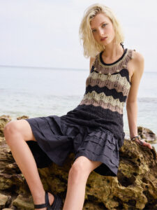 Es sind die urig-schlammigen Töne, die den modern interpretierten Safari-Look prägen. Hier beeindruckend dargestellt als Top mit Wellenstrukturen und breiter Ausschnittpasse, die zusätzlich mit Noppen verziert wird. Gestrickt wird hier erst das Rückenteil, dann das Vorderteil. Beide hierfür benötigten Muster benötigen schon etwas Aufmerksamkeit, sind aber nicht sonderlich kompliziert. Die klare und übersichtliche Strickschrift der Anleitung hilft zusätzlich dabei, den Überblick zu bewahren. Als nächstes wird die Passe gestrickt, dann die Noppen. Dann nur noch die Seitennähte schließen, die Noppen und die Passe annähen.