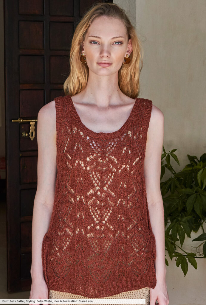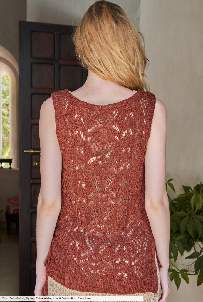 Ein feines Leinengarn, gemixt mit Fasern aus Baumwolle und Viskose, bildet die Basis für dieses extravagante Top in brillantem Rotbraun. Die markante Musterführung erfordert jedoch etwas Geduld und Strickerfahrung. Dafür gibt es eine übersichtliche Strickschrift, die du in der Anleitung findest und mit deren Hilfe du zum Erfolg kommst. Die Seitennähte bleiben weitgehend offen und werden zum Schluss mit zur Schleife gebundenen Rippenbändern geschlossen.