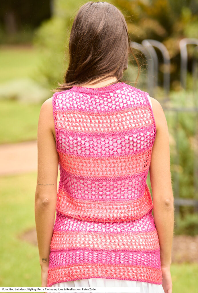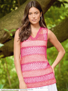 Strickenthusiasten dürften sich über dieses Modell besonders freuen, hat es doch immerhin fünferlei Muster. Da sind zum einen zweierlei einfache Lochmuster, die jeweils getrennt werden von glatt rechts und kraus rechts, und schließlich ein 2/2-Rippenmuster für die Blende am V-Ausschnitt. Ergebnis ist ein ärmelloses Top, das bis über die Hüfte reicht und auf diese Weise auch mal kleine Pölsterchen verschwinden lässt. Ein Garn aus 100 % Leinen in zwei Farben ist dafür genau das Richtige. Eine Anleitung gibt es für die Größen 36/38, 40/42 und 44/46.