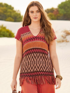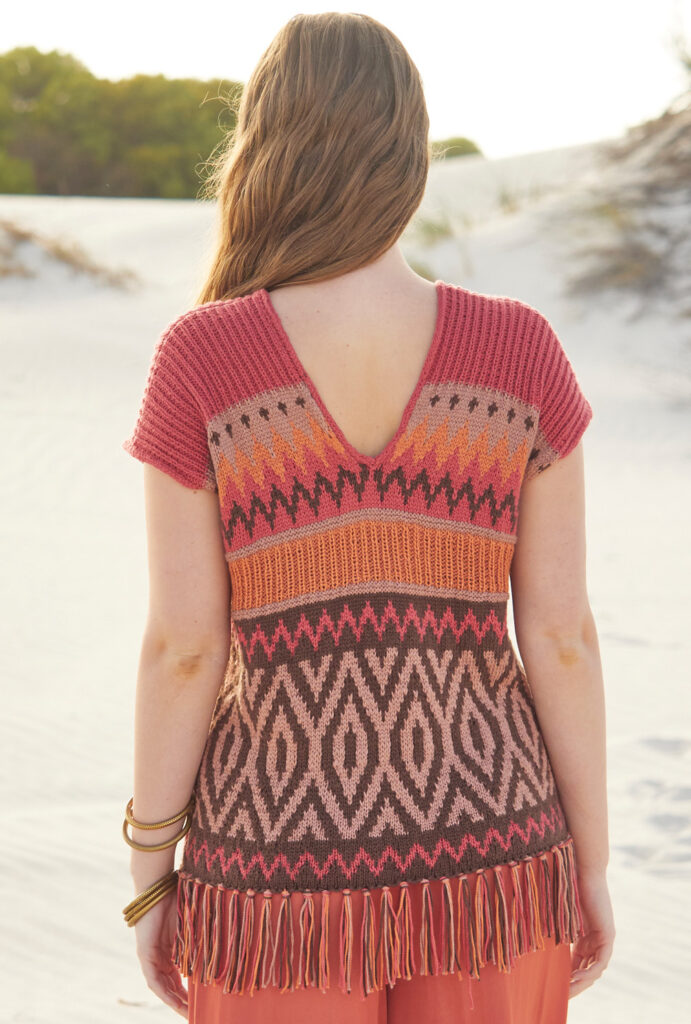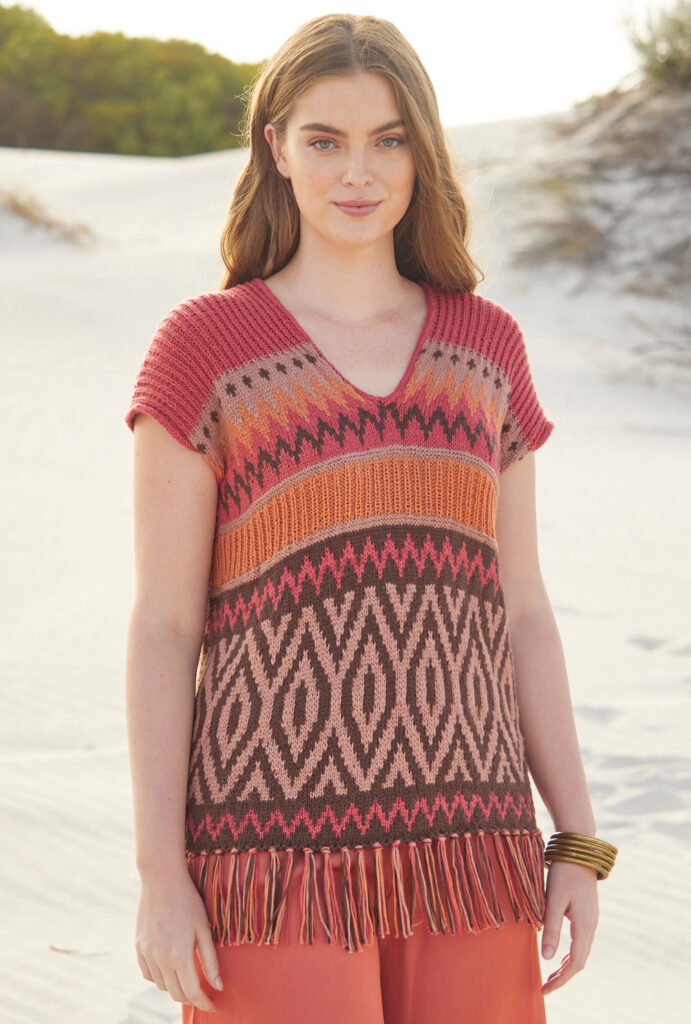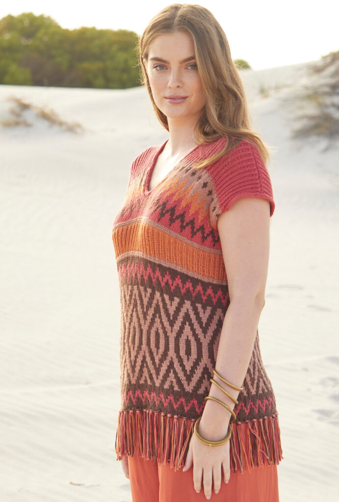 Die ärmellose Tunika mit Fransen versprüht mit ihrem vierfarbigen Jacquardmuster ein folkloristisches Flair. Kraftvoll und selbstbewusst zugleich! Rücken- und Vorderteil werden bis zu den Armausschnitten in Runden gestrickt, dann wird in vier Teilen weitergearbeitet. Auf diese Weise ergibt sich automatisch ein V-Ausschnitt (auch am Rückenteil) und die überfallenden Schultern, die wie kurze Ärmel wirken. Das Baumwolle-Viskose Mischgarn in Dunkelrot, Dunkelbraun, Altrosa und Braunorange lässt sich mit 5er-Nadeln gut verstricken. Eine Anleitung gibt es für die Größen 36 – 40, 42 – 46 und 48 – 52.